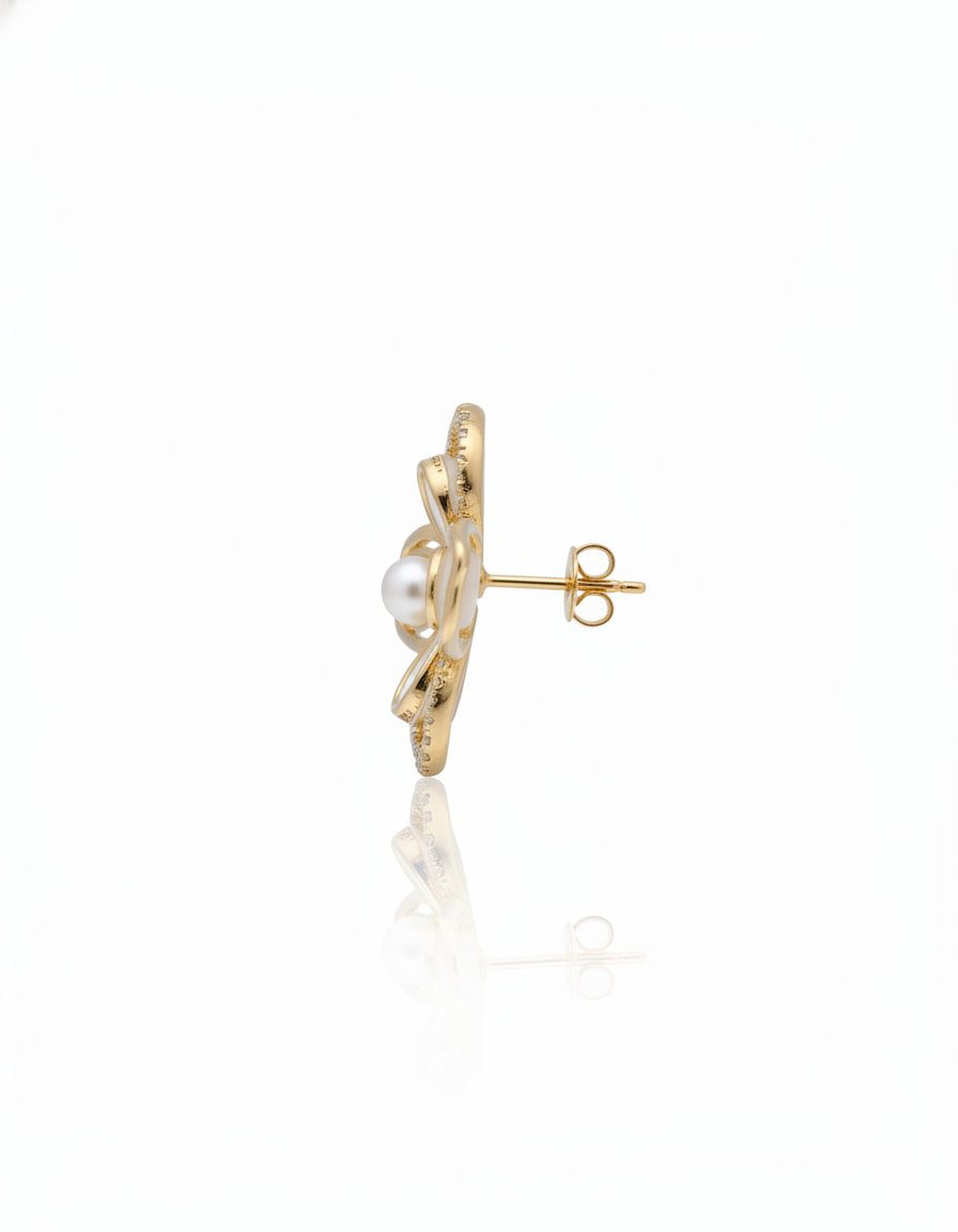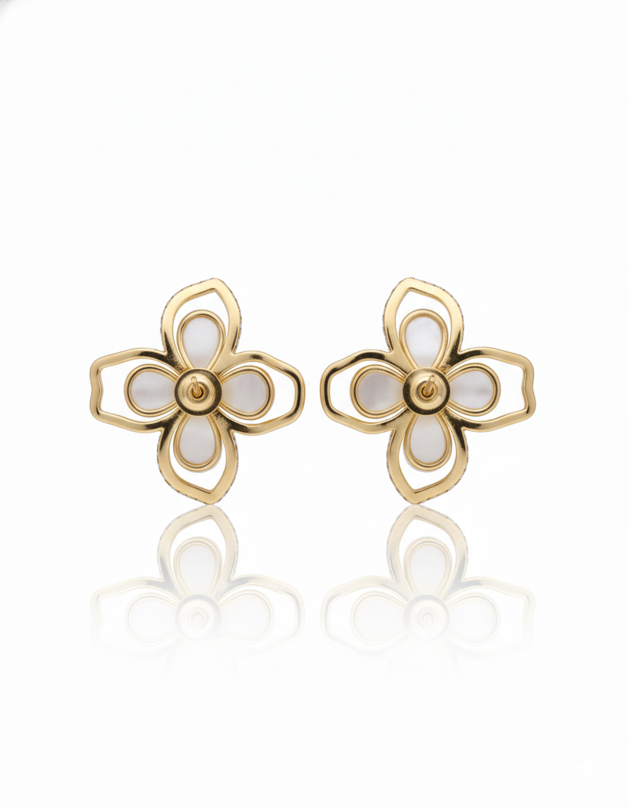 Add a touch of feminine grace to your jewelry collection with these exquisite floral quatrefoil studs. Featuring soft, iridescent mother-of-pearl petals set within a polished gold-toned openwork frame, these earrings offer a light and airy silhouette.