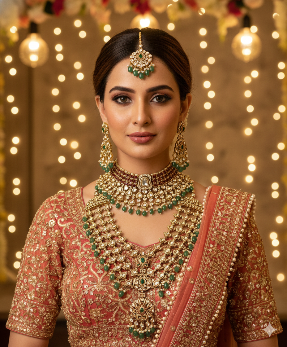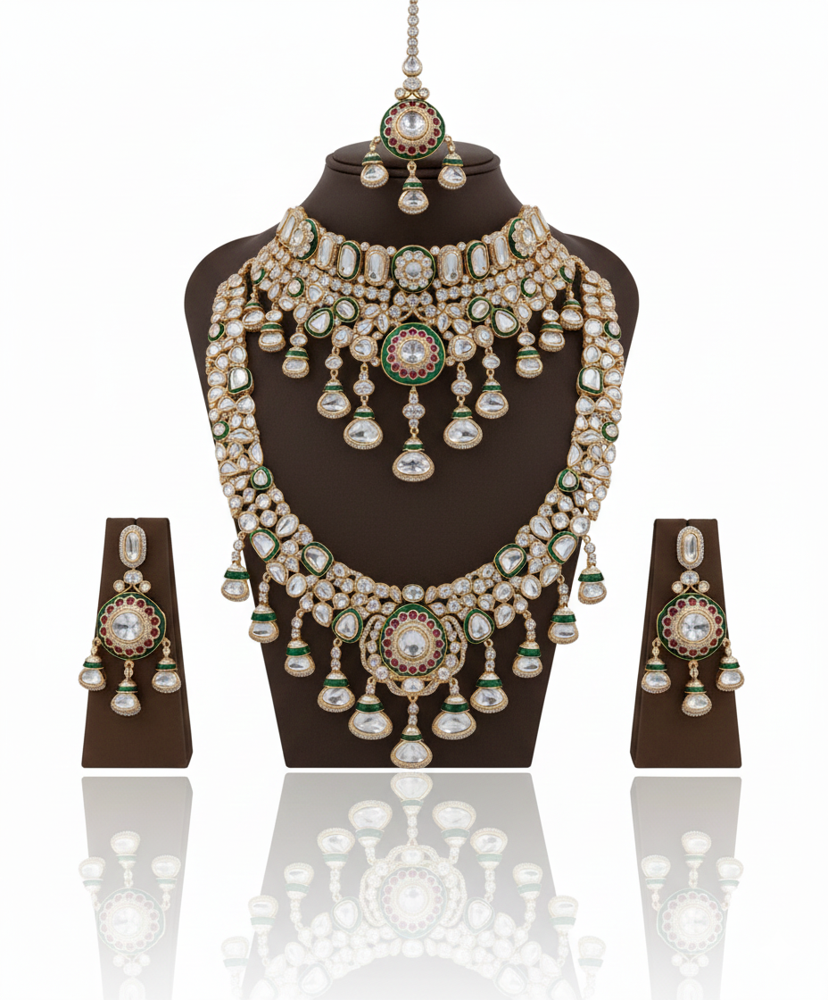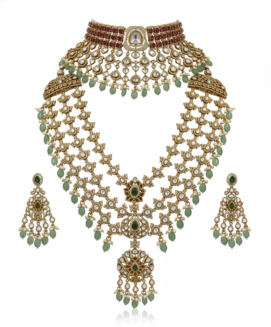 The Mughal Emerald Polki Set is an exquisite expression of royal Indian craftsmanship. Designed with traditional polki-style stones, this grand set features intricate gold-toned detailing highlighted by rich emerald green bead drops. The statement choker is beautifully layered with uncut stone motifs, creating a regal neckline, while the long necklace showcases an elegant lattice pattern adorned with a majestic central pendant. Matching earrings complete the ensemble with perfect harmony. Ideal for bridal wear, weddings, and royal celebrations, this set reflects timeless Mughal elegance, luxurious detailing, and heritage charm, making it a perfect choice for those who desire a bold yet graceful traditional look.