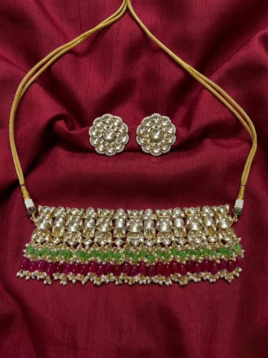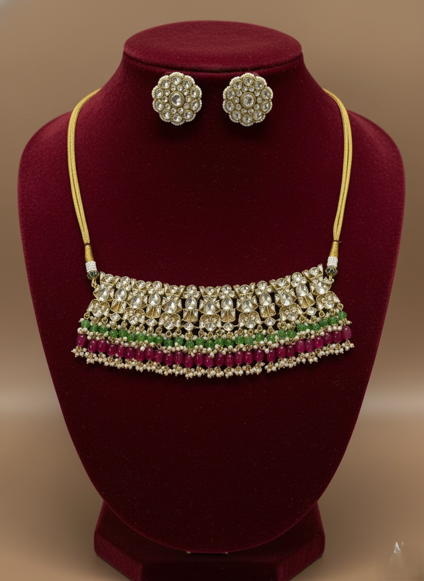 A majestic gold-plated choker set featuring a wide band of intricate Polki Kundan work, layered with rows of emerald-green and ruby-red beads. Accompanied by matching oversized floral studs, this ensemble offers a regal look inspired by heritage royal jewelry.
