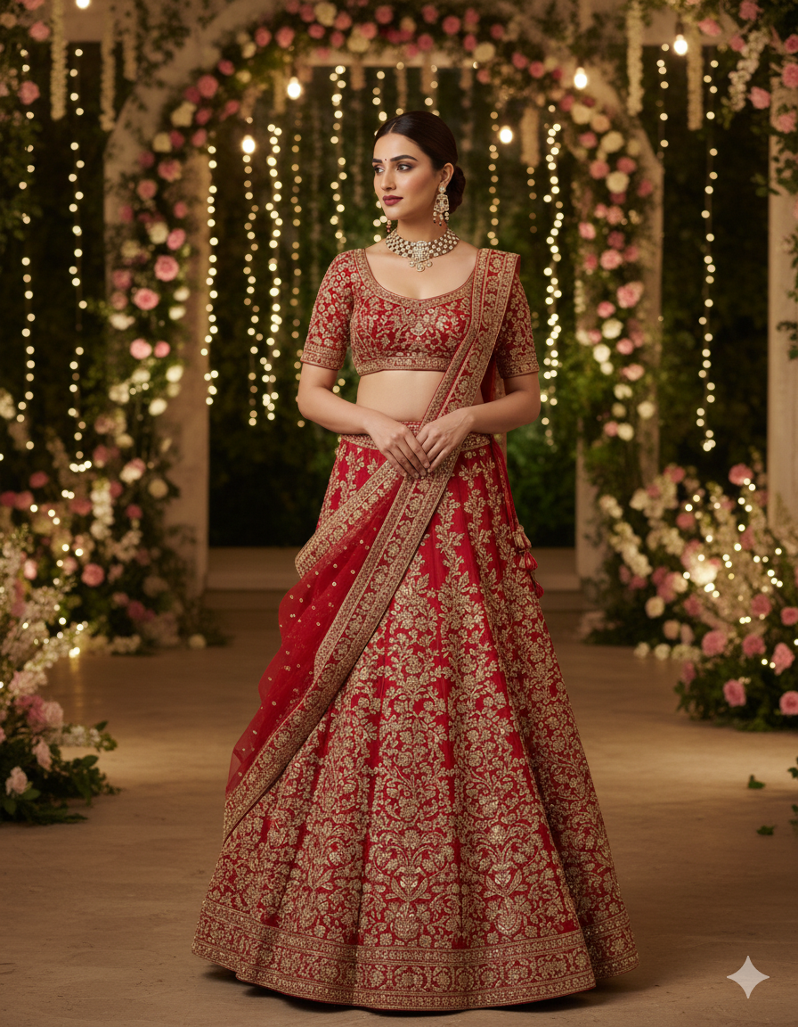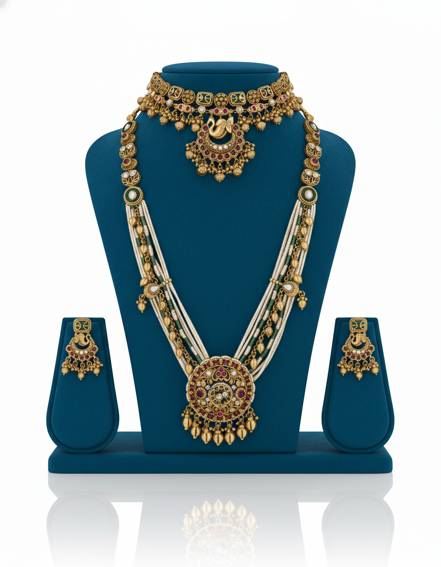 The Nazakat Ruby Regal Choker Set is a striking celebration of refined opulence and royal charm. Crafted in a bold choker silhouette, this exquisite necklace features neatly aligned ruby-hued stones framed with shimmering diamond-cut detailing, creating a rich, structured look. The intricately designed central motif is enhanced with delicate dangling elements that add graceful movement and sophistication. Paired with matching statement earrings accented with ruby drops, this set is perfect for bridal wear, receptions, and grand festive occasions. Nazakat Ruby Regal embodies elegance, confidence, and timeless luxury—ideal for women who desire a powerful yet graceful jewelry statement.