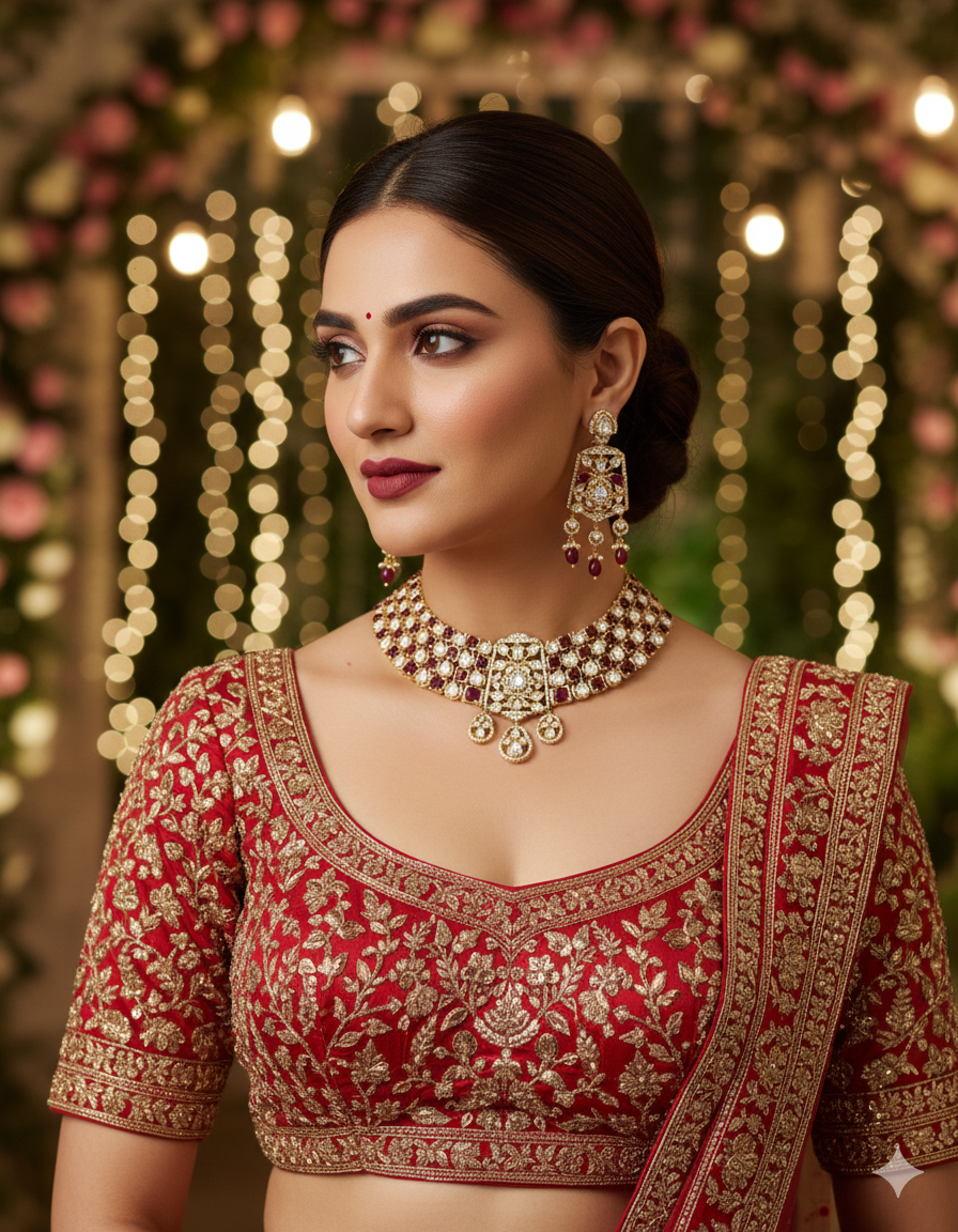 A luxurious ruby-studded choker set with diamond-style brilliance and elegant dangling accents.