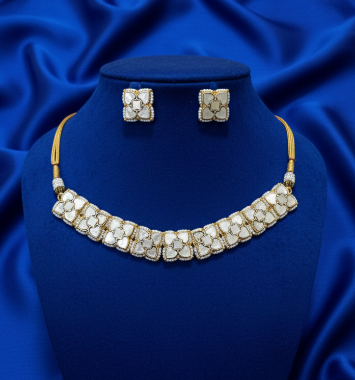 • Coordinated Earrings: The set includes a pair of square stud earrings that perfectly replicate the necklace’s floral units, making them versatile enough to be worn on their own for smaller occasions.
