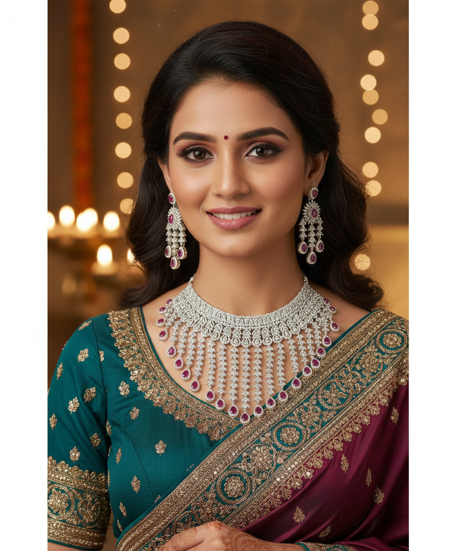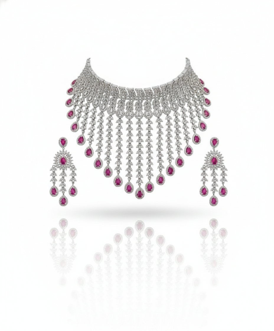 Command attention with the breathtaking Noor-e-Ruby Cascade Bridal Choker Set, a masterpiece of regal elegance and intricate craftsmanship. Designed in a luxurious white metal finish, this grand choker features rows of delicate cascading motifs adorned with rich ruby-toned teardrop stones that shimmer with every movement.
