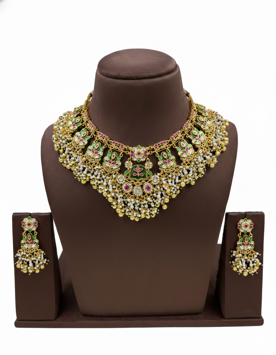 The Noor-e-Sultan Emerald Polki Bridal Set is an exquisite ode to royal grandeur and timeless craftsmanship. This majestic long haar set showcases an intricate arrangement of polki-style stones framed in antique gold, accented with deep emerald-green centers and delicate pearl hangings. The ornate floral and geometric motifs flow gracefully, creating a layered, palace-inspired silhouette that commands attention.
