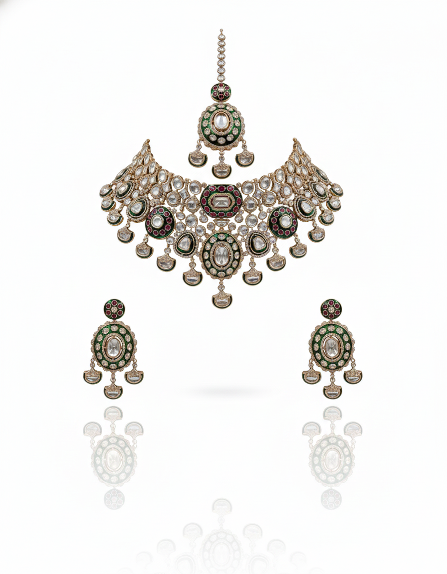 A majestic polki-style necklace set adorned with emerald green and ruby accents, echoing royal heritage.