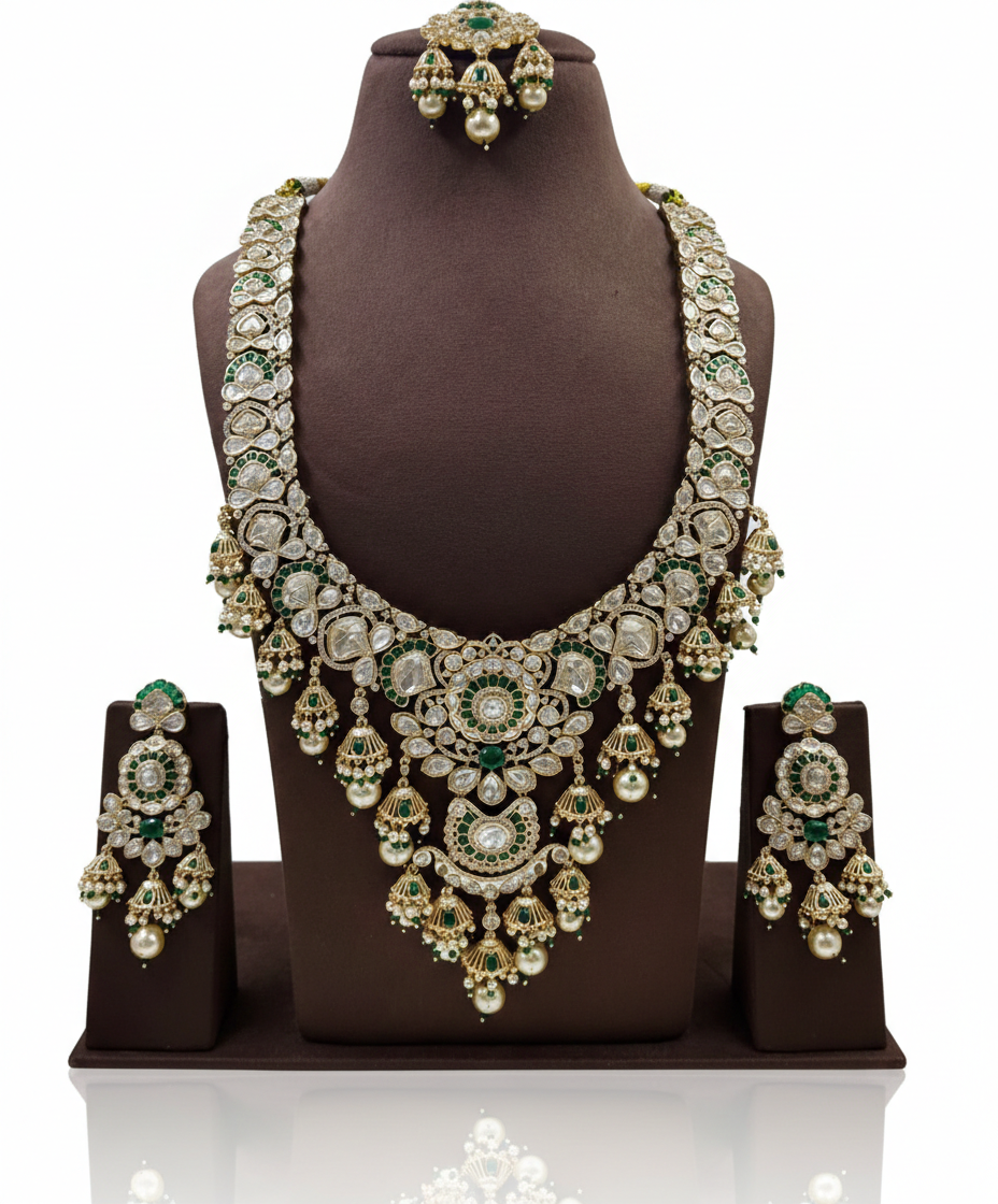 Gracefully opulent and steeped in tradition, the Noor-e-Zevar Polki Bridal Necklace Set is a masterpiece of classic Indian jewelry artistry. This elegant set features radiant uncut polki diamonds arranged in intricate floral and crescent motifs, highlighted with delicate ruby accents and finished with soothing emerald bead drops.