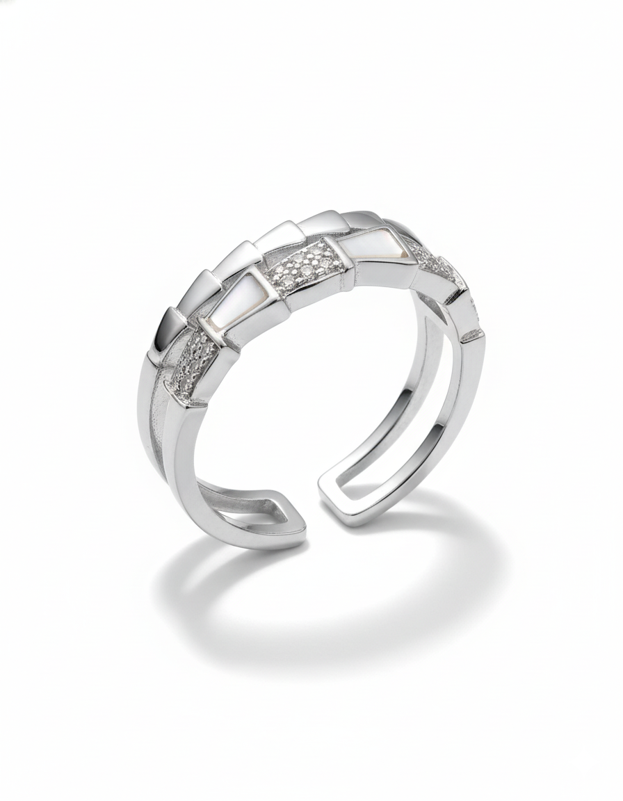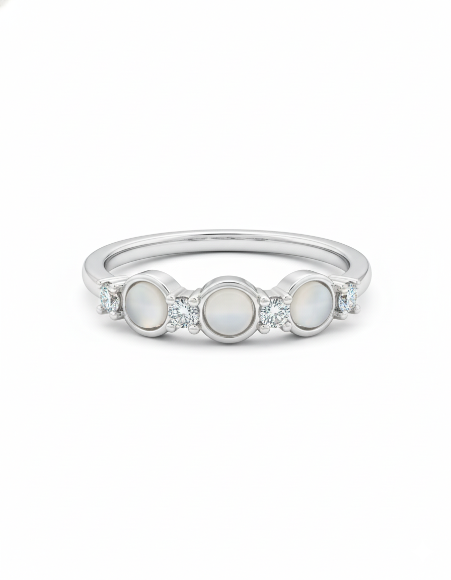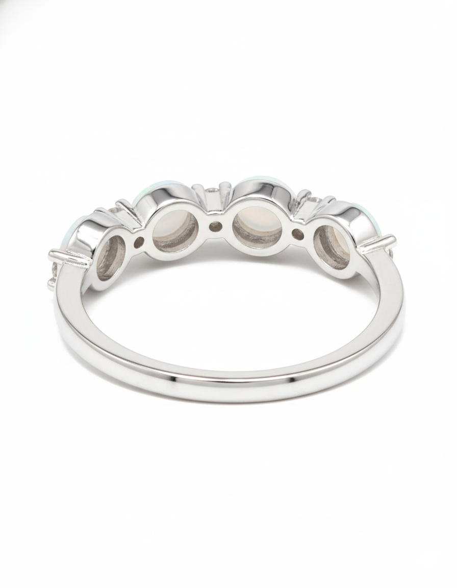 This graceful silver-tone ring showcases a refined trio design with soft, iridescent opal stones set along the band. Each opal is beautifully complemented by small round-cut diamond accents, adding subtle sparkle and elegance. The slim polished band enhances the delicate appearance, making it perfect for everyday wear or layering with other rings. Timeless and feminine, this opal trio ring is an elegant choice for those who love minimal yet sophisticated jewelry designs.