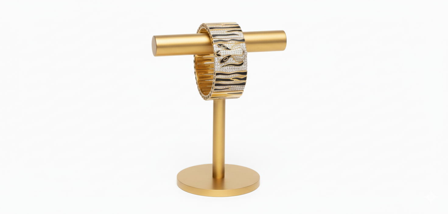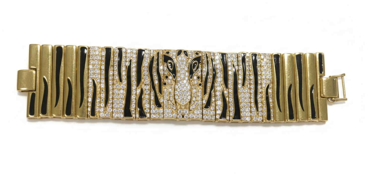 The feline motif is seamlessly integrated into a rhythmic pattern of hand-applied black enamel stripes, set against a warm high-polish gold finish. Each link is designed to sit flat, ensuring the intricate animal print remains perfectly aligned. Finished with a robust fold-over safety clasp, this bracelet is a definitive “power piece” for any collection.
