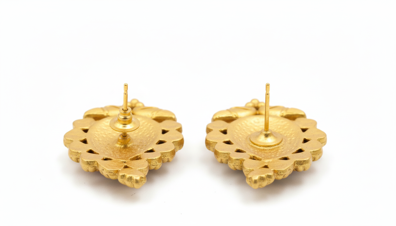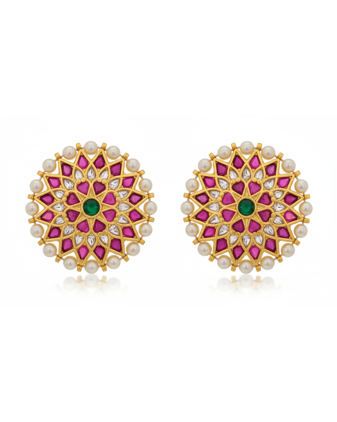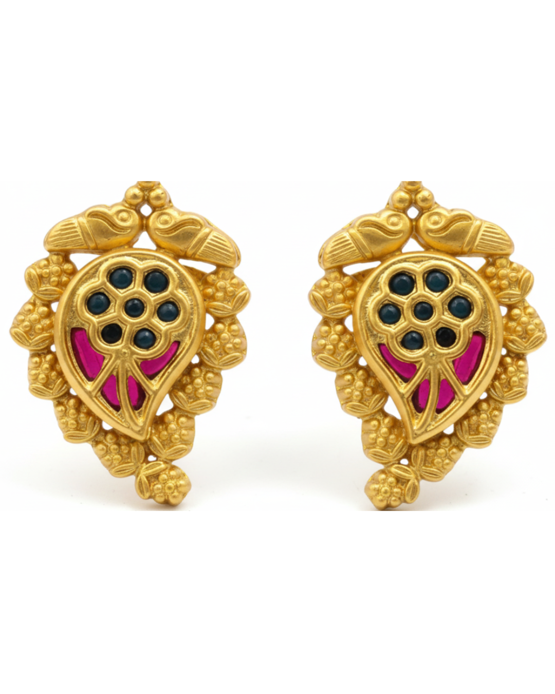 Peacock Paisley Silver Studs showcase exquisite heritage-inspired artistry with a rich blend of symbolism and elegance. Crafted in silver with a traditional gold-toned finish, these earrings feature a graceful paisley motif crowned by twin peacocks, representing beauty and prosperity. Intricate detailing, black bead accents, and deep pink enamel highlights add depth and contrast, creating a striking visual appeal. The textured borders and ornamental design reflect classic Indian craftsmanship, making these studs perfect for festive celebrations, weddings, and ethnic ensembles. Bold yet refined, they bring timeless charm and cultural richness to every look.