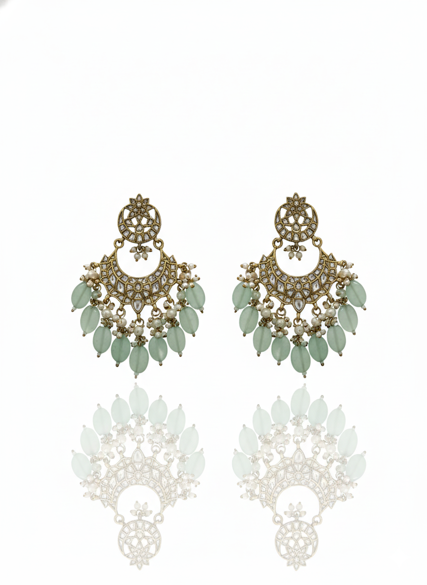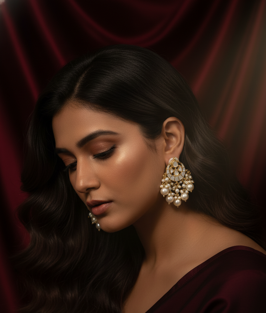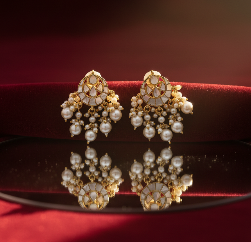 Chic Mother-of-Pearl and Kundan Studs finished with a graceful fringe of cascading pearls. These gold-plated earrings offer a clean, white-toned aesthetic that pairs perfectly with both traditional Indian outfits and contemporary western wear
