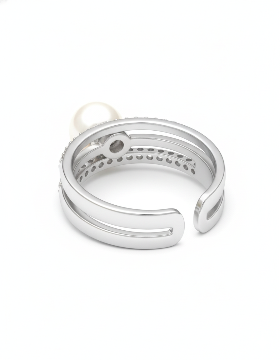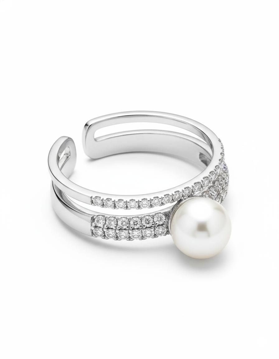 Elegant open-style silver ring featuring a lustrous pearl and sparkling diamond-studded bands.