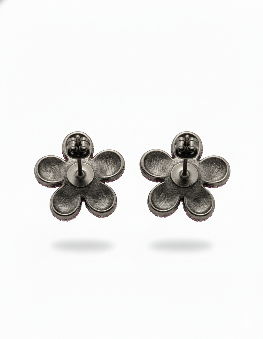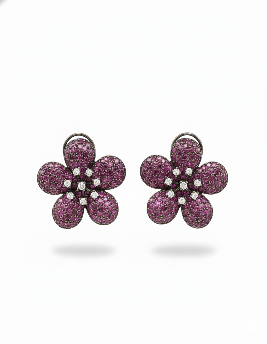 Exquisite floral stud earrings featuring a vibrant pavé setting of deep pink rubies. Each five-petal blossom is centered with shimmering white diamond accents, set in a sleek, darkened metal for a sophisticated, modern contrast.