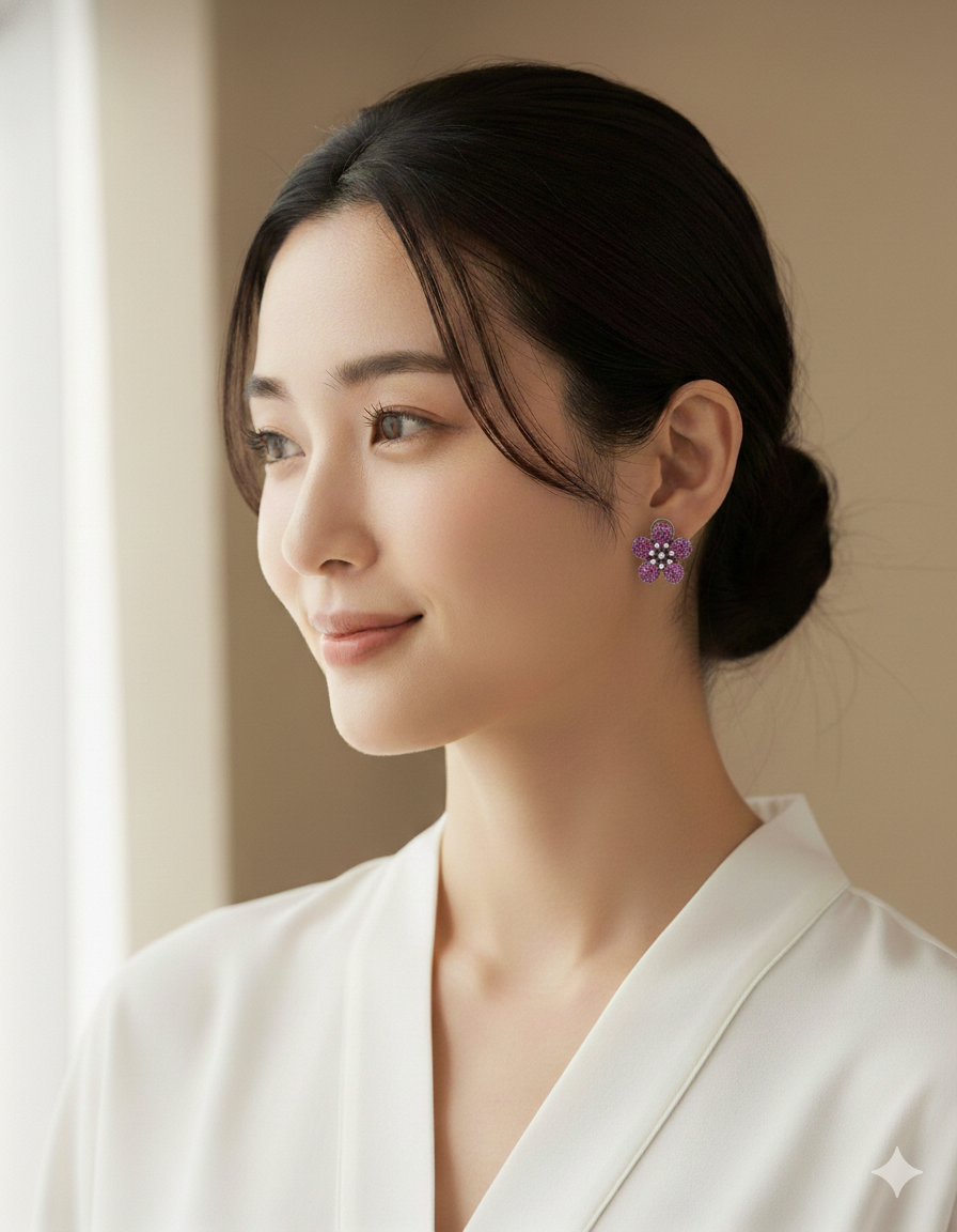 Radiant Accents: The center of each blossom is highlighted by a cluster of brilliant white diamonds, adding a touch of classic sparkle that draws the eye.