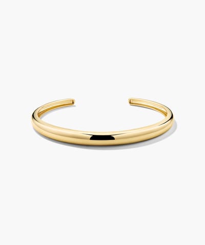 This refined open cuff bracelet features a smooth, rounded gold silhouette with a high-polish finish for a sophisticated, minimalist look. Designed for effortless wear, the open-ended style slips on easily while maintaining a secure, comfortable fit. Perfect worn alone or layered with other bracelets, this timeless piece adds understated elegance to any ensemble, day or night.
