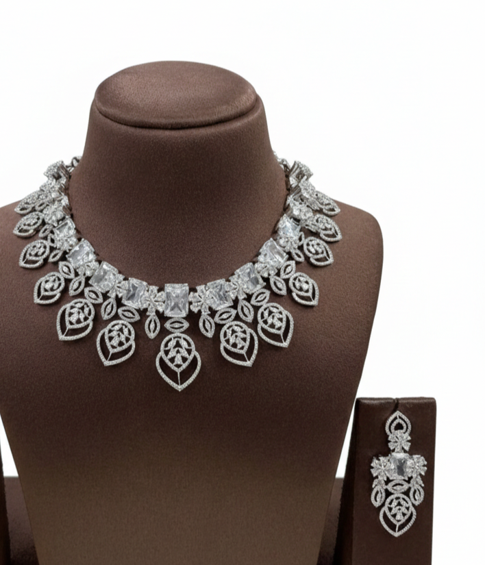 A breathtaking silver-toned jewelry set featuring a majestic combination of large emerald-cut crystals and delicate pavé leaf motifs. This set includes a wide statement necklace and matching designer earrings, offering a high-shine, luxurious finish for evening events and bridal occasions.