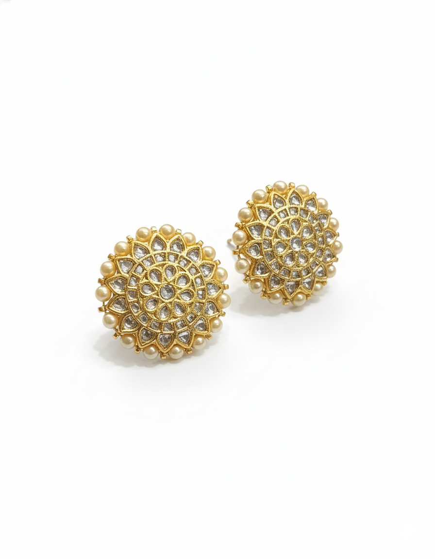 Stunning sunflower-inspired studs featuring a multi-layered arrangement of brilliant Kundan stones and a luminous outer border of polished cream pearls.