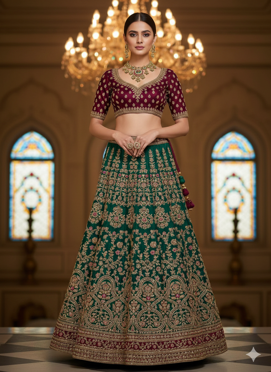 This exquisite Rajwada-inspired necklace set reflects the grandeur of traditional Indian craftsmanship. Designed in a rich gold-tone finish, the set features intricate meenakari work highlighted with emerald-green and ruby-pink accents. The centerpiece showcases a beautifully detailed floral motif, enhanced with delicate pearl drops that add graceful movement and charm. Matching earrings echo the same regal design, completing the ensemble with elegance. Ideal for weddings, bridal occasions, and festive celebrations, this statement jewelry set pairs beautifully with sarees and lehengas, offering a timeless heirloom appeal blended with royal sophistication.