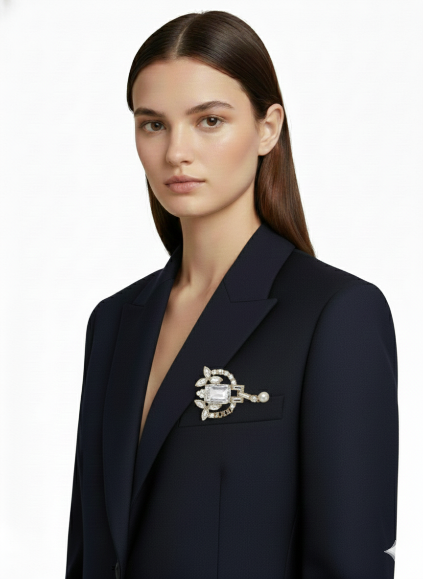 This exquisite brooch blends vintage Art Deco architectural elements with modern elegance. At its center sits a large, radiant emerald-cut crystal, flanked by delicate marquise-cut stones that form a floral-inspired base. The upper structure features geometric baguette crystals and a curved arch embellished with round-cut stones, culminating in a single, lustrous cream pearl at the pinnacle. Crafted with a polished gold-tone finish, this piece offers a sophisticated silhouette and brilliant light refraction, making it a perfect centerpiece for formal attire or festive ensembles.