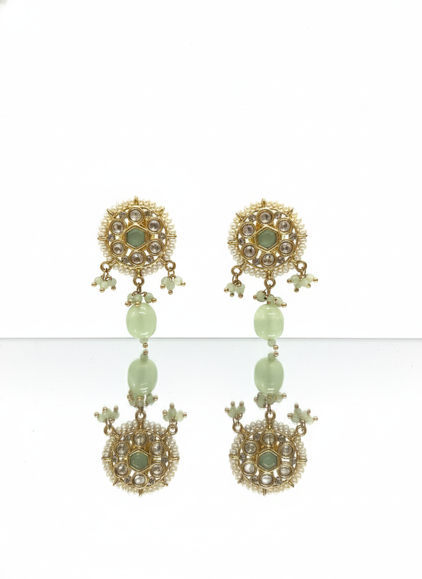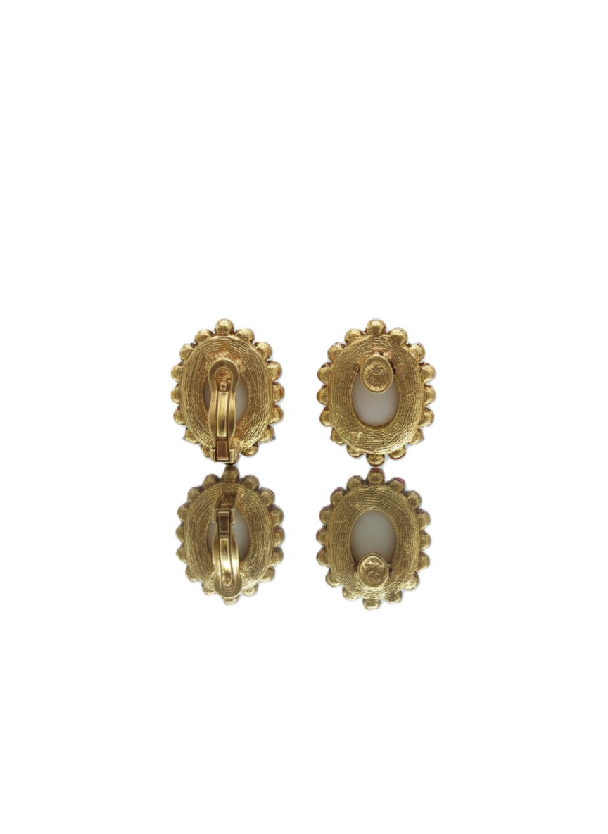 • Each earring centers on a large, smooth oval white stone, providing a clean and luminous focal point.
