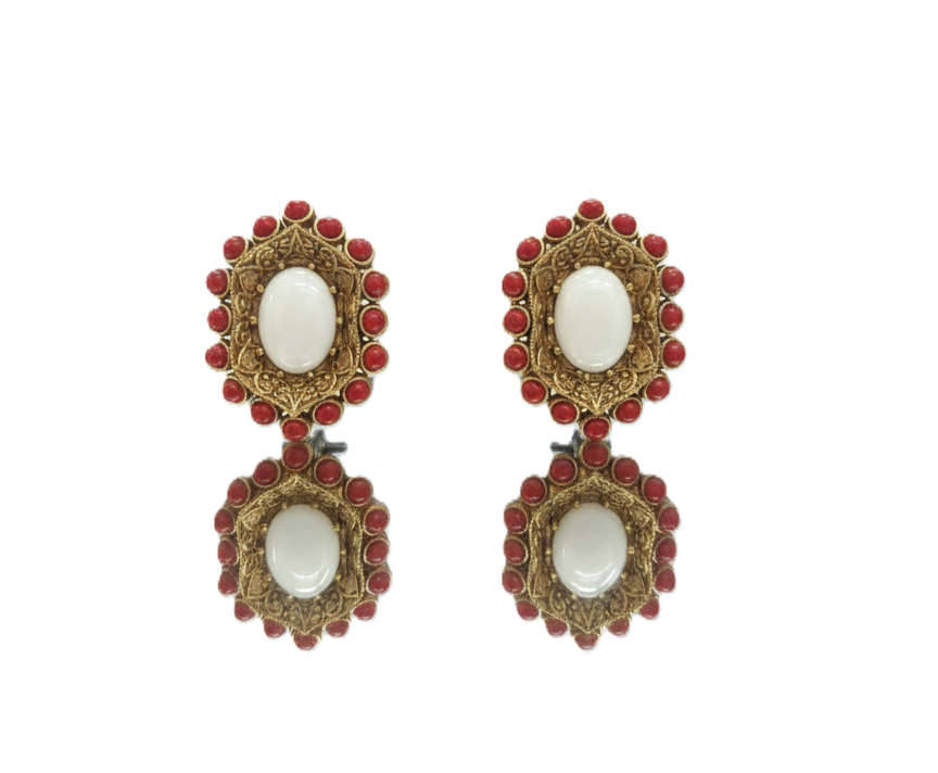 Elegant gold-toned oval studs featuring a smooth white cabochon center framed by intricate filigree and a vibrant red coral-style beaded halo.