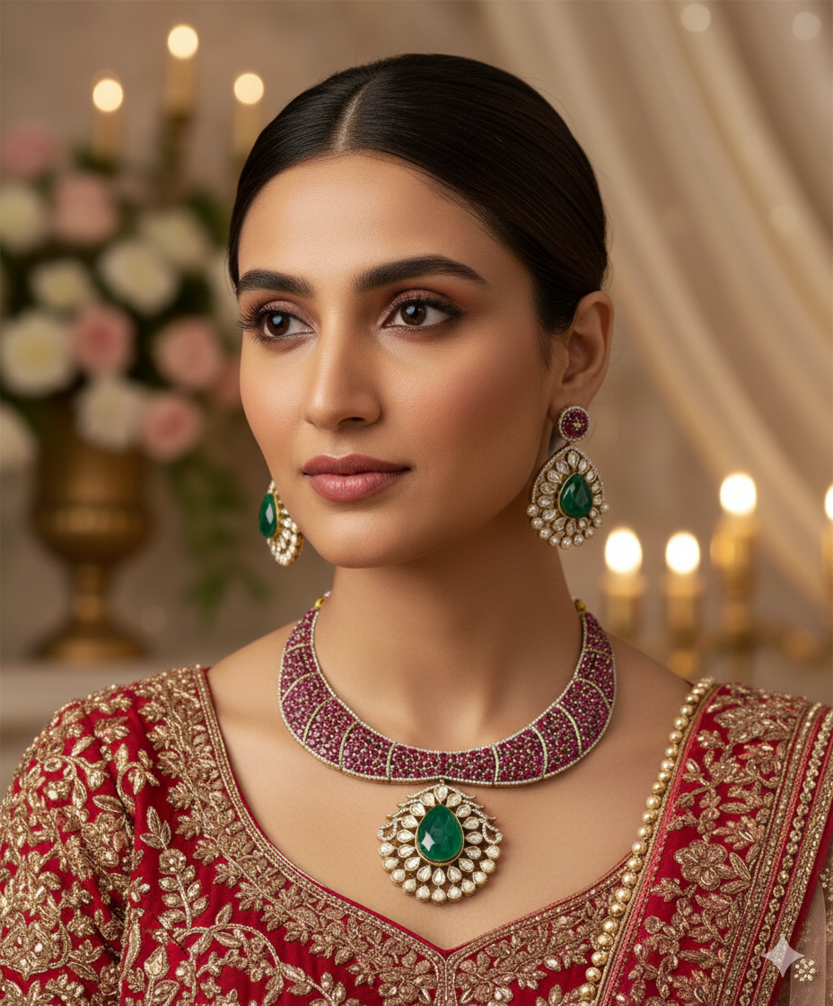 A majestic heritage jewelry set featuring a broad ruby-studded collar necklace and matching drop earrings. Anchored by striking pear-cut emeralds and accented with brilliant white stones, this set embodies royal sophistication and artisanal excellence.