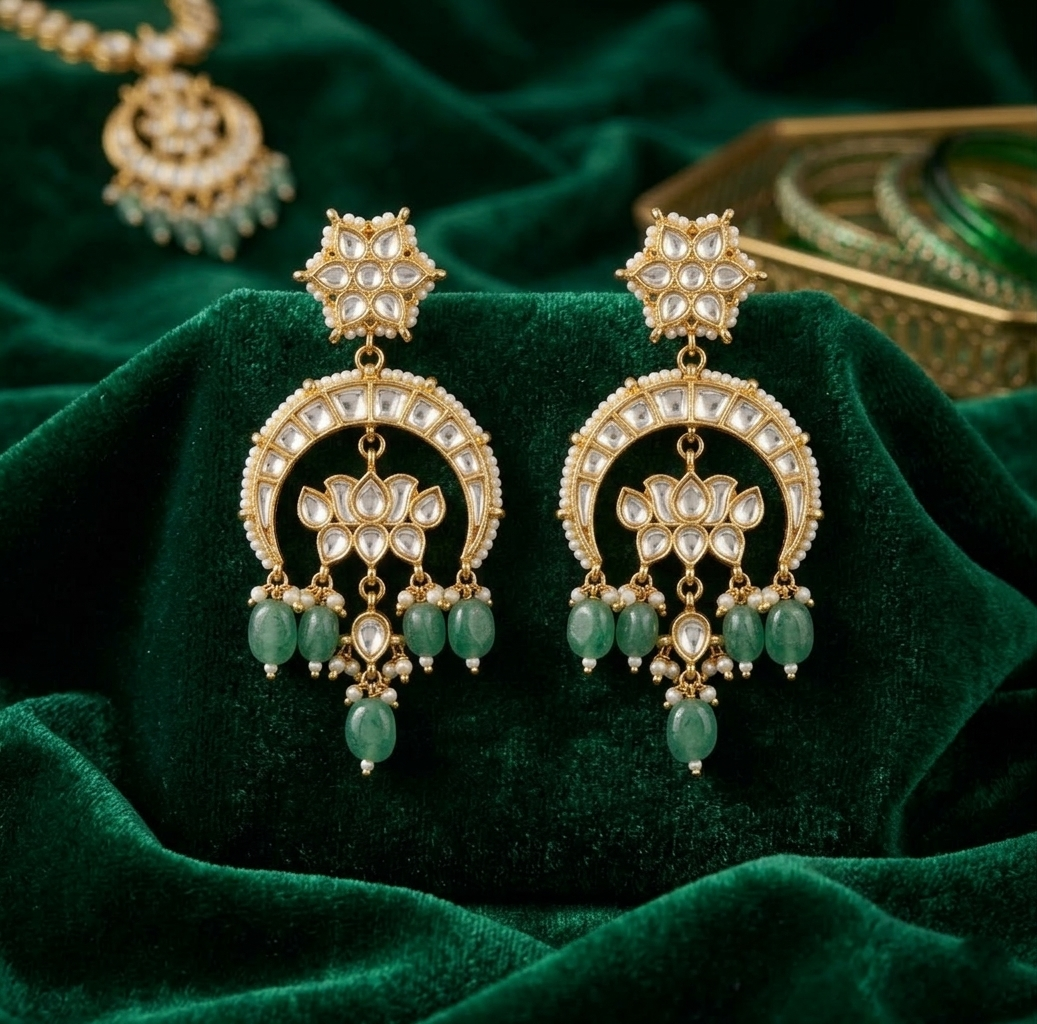 Regal Kundan Chandbali Earrings with Emerald Beads