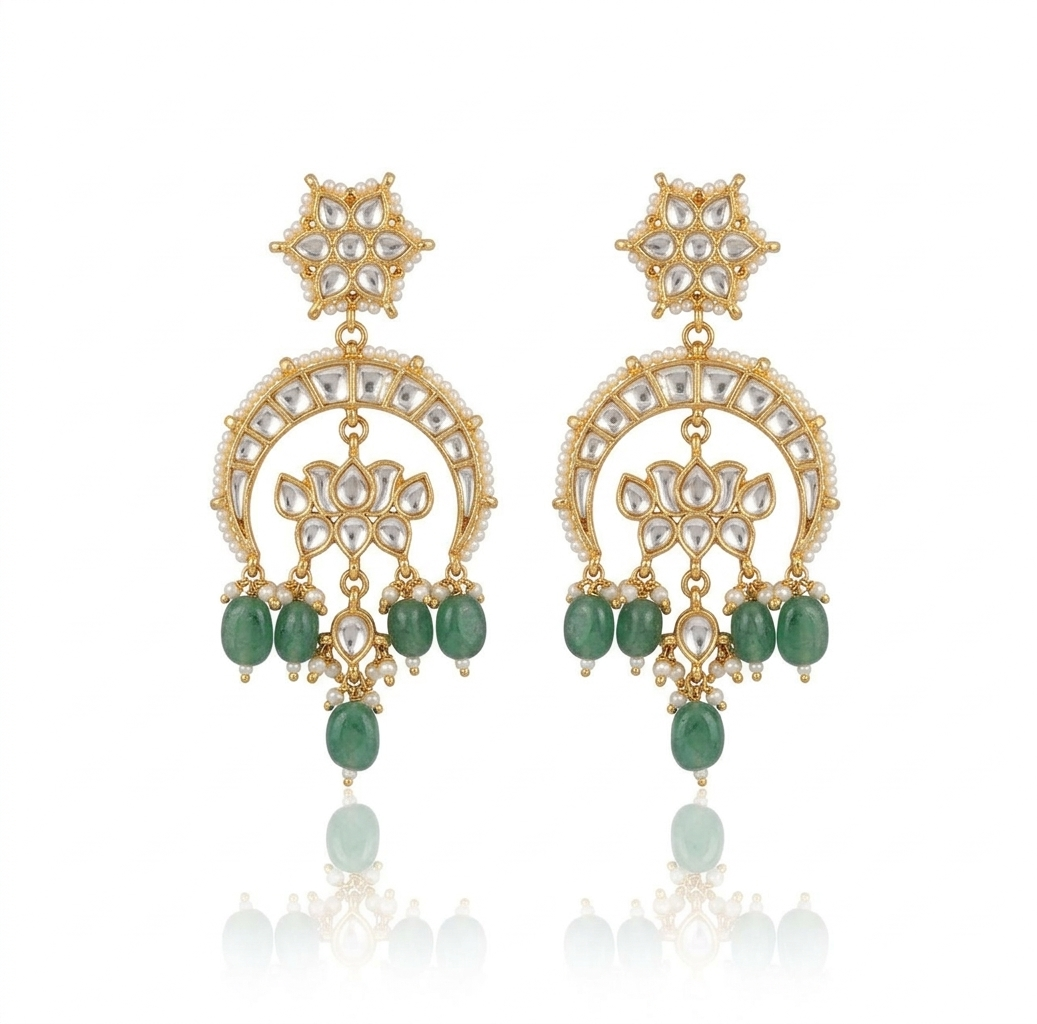 gold-plated Chandbali earrings featuring intricate Kundan stonework, delicate pearl borders, and vibrant emerald green bead drops. A timeless blend of traditional craftsmanship and royal elegance.