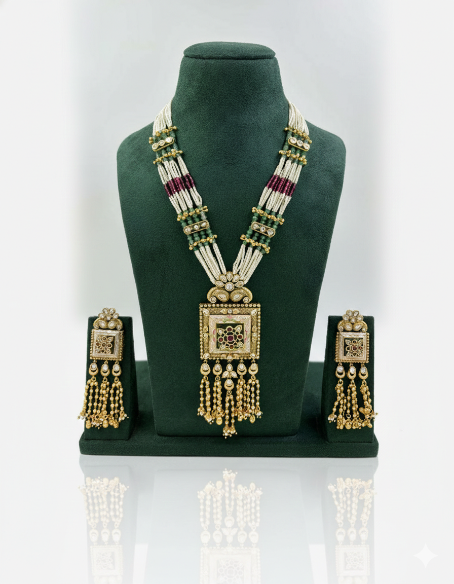 Step into the spotlight with a jewelry set that defines grace and heritage. This Kundan Rani Haar is a masterpiece of traditional design, featuring a large, intricate pendant with Jadau-style stone settings. The center is highlighted by a rich emerald green stone, surrounded by shimmering polki-cut crystals and elegant teardrop droplets.