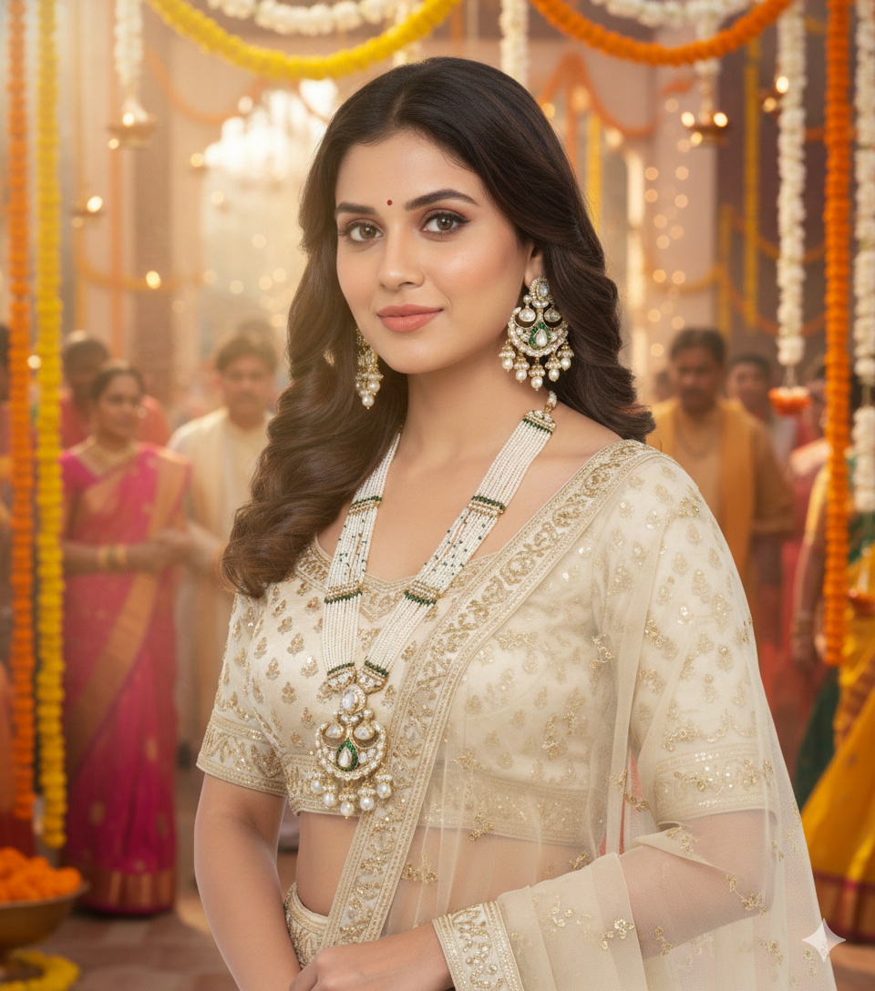 Material: High-grade alloy with gold-toned finishing, synthetic pearls, and premium stones.