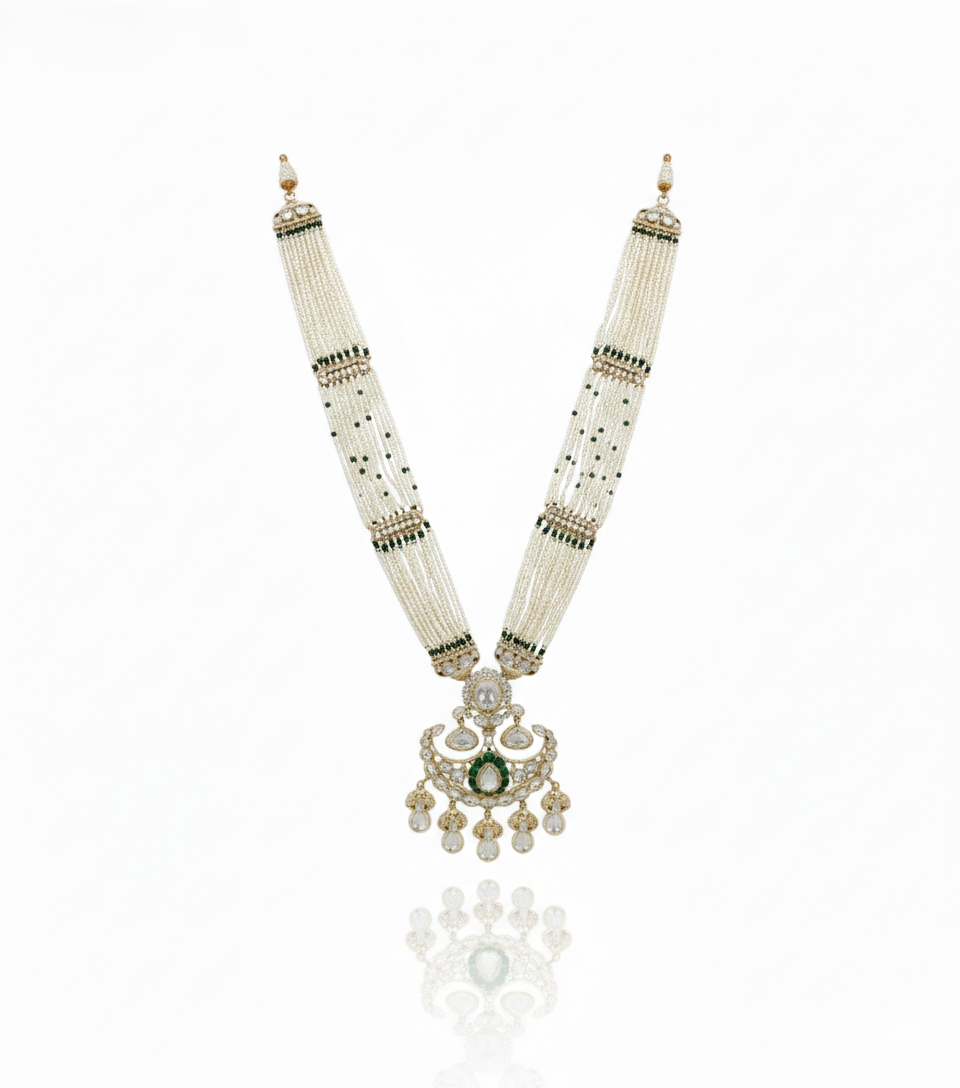 Design: Traditional Kundan & Polki craftsmanship with a contemporary multi-strand silhouette.