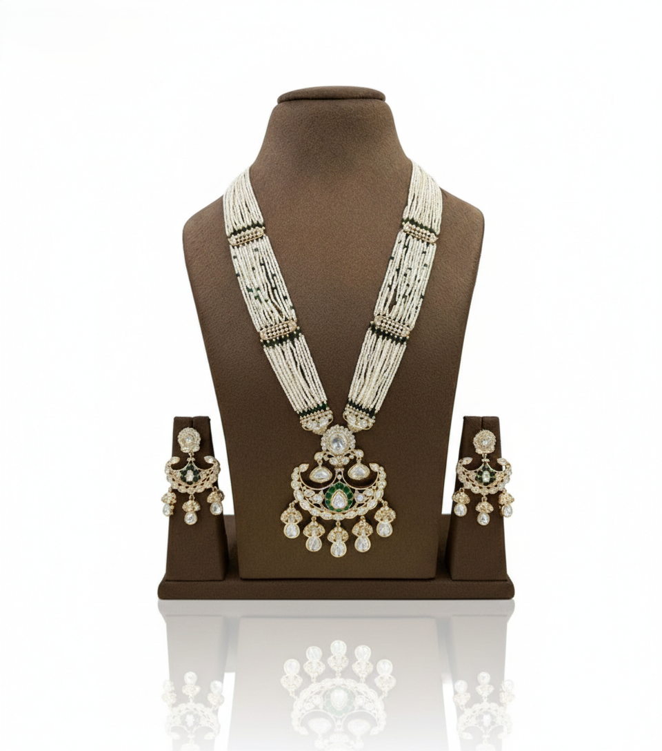 Regal Kundan & Emerald Multi-Strand Pearl Rani Haar Set