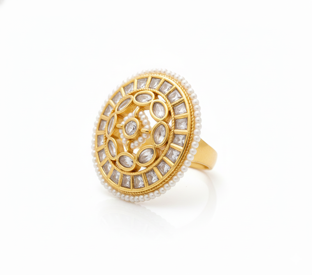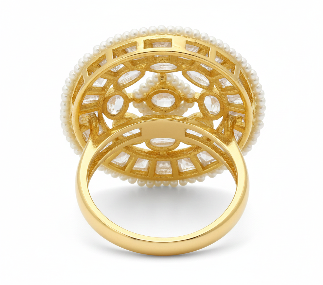Make a grand statement with this masterfully engineered Gemstone and Pearl Mandala Ring. This piece is a celebration of symmetry and traditional craftsmanship, featuring an expansive circular face designed to command attention.