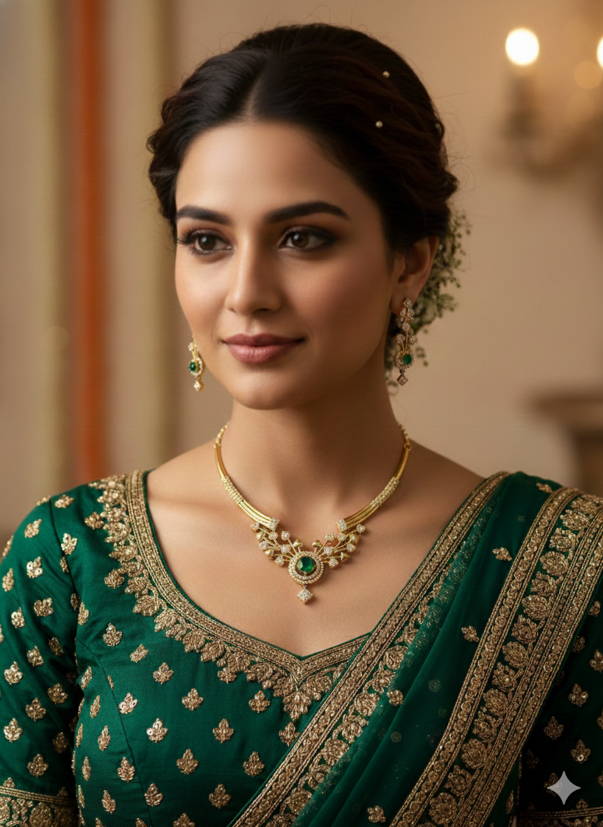 A breathtaking dual-layer necklace set featuring a refined inner choker and a majestic outer “Haar.” Crafted with sparkling white stones and accented by soft rose-pink droplets, this set is the ultimate expression of feminine grace for grand weddings.