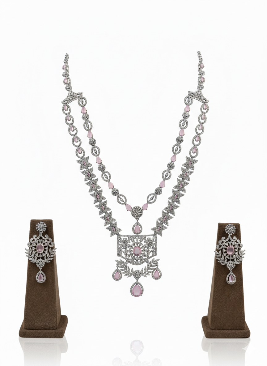 Gemstone Details: The set is encrusted with premium-quality simulated diamonds that catch the light from every angle. The subtle use of rose-pink stones in teardrop and oval shapes adds a touch of feminine grace and a pop of soft color.