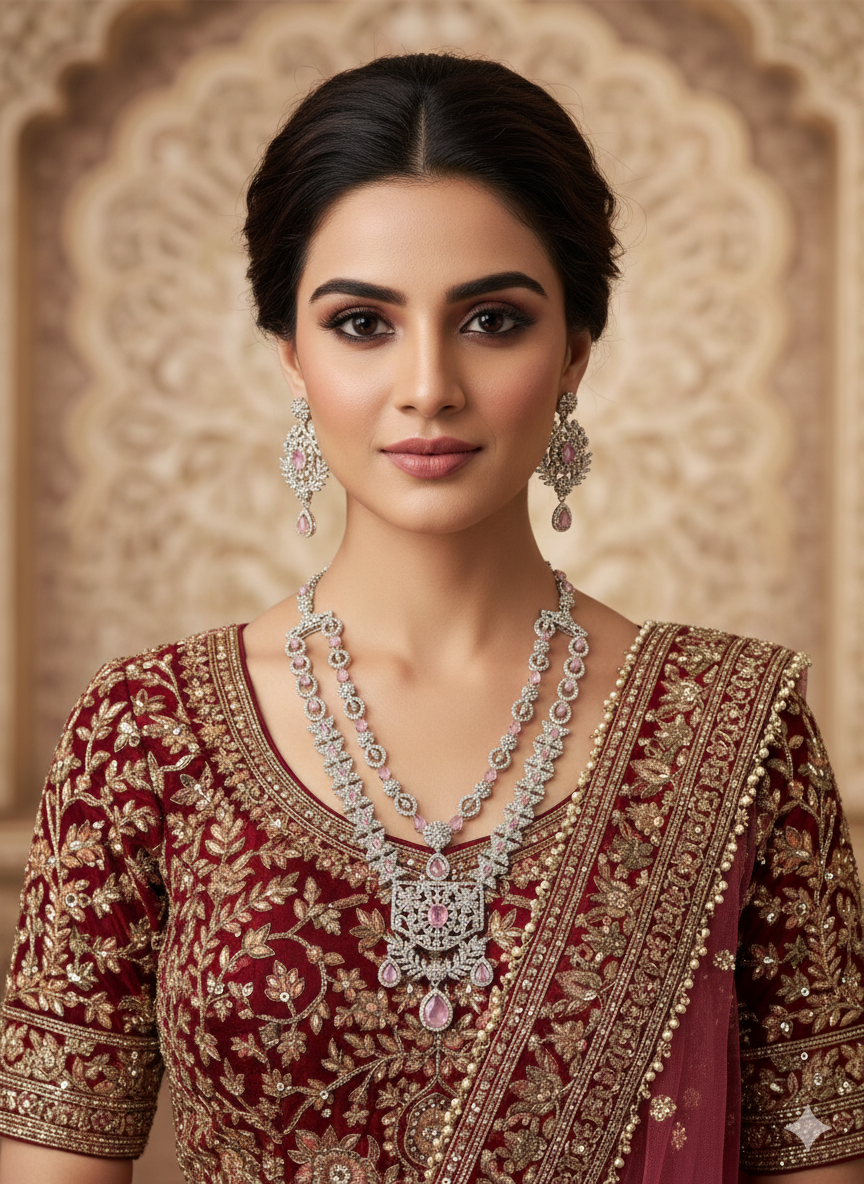 Elevate your bridal or festive ensemble with this breathtaking dual-layer necklace set. Featuring a delicate inner choker and a majestic outer “Haar,” this set is meticulously crafted with sparkling white stones and accented by soft rose-pink pear-cut droplets. Complete with matching ornate chandelier earrings, it offers a sophisticated blend of contemporary silver finish and traditional Indian artistry.