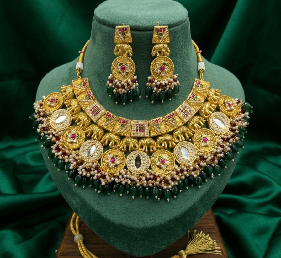 • Design: Traditional bib necklace with elephant carvings and Kundan-style embellishments.