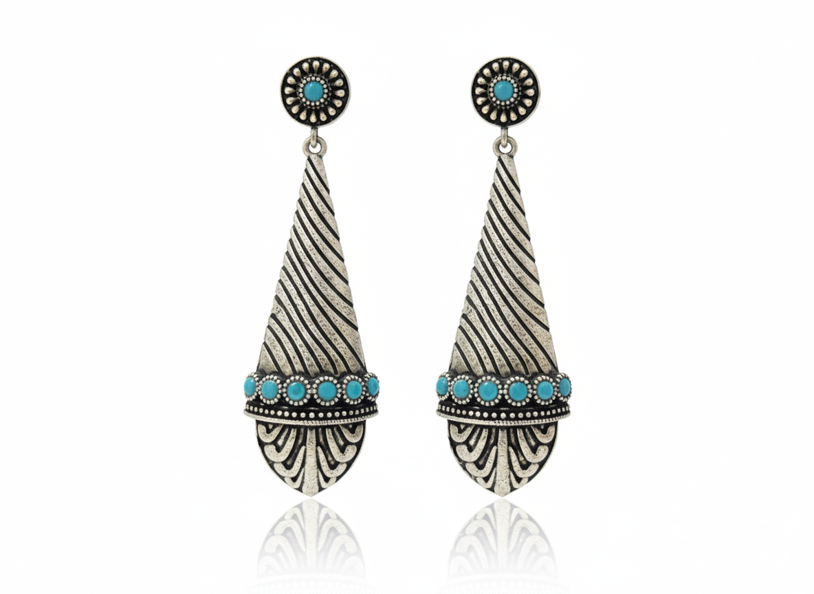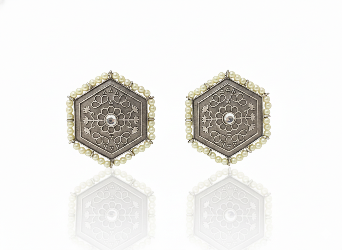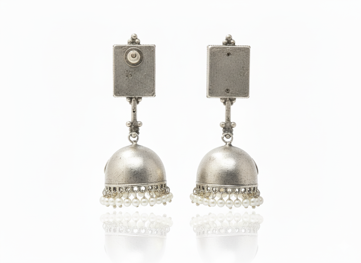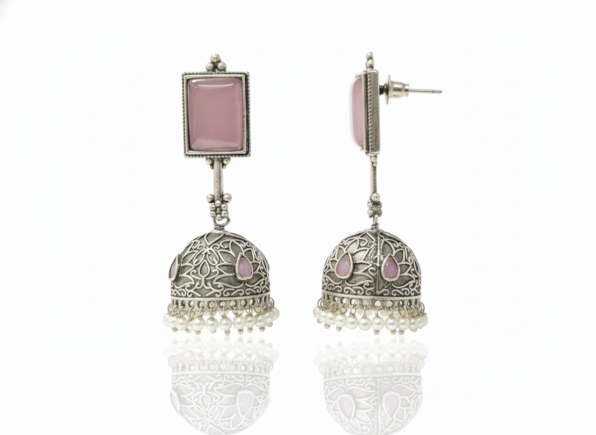 Enhance your ethnic look with these Rose Quartz Pearl Jhumka Earrings, beautifully crafted in an antique oxidized silver finish. The rectangular rose quartz stud adds a soft, elegant touch, while the handcrafted jhumka dome showcases intricate filigree detailing highlighted with subtle pink stone inlays. Finished with graceful pearl drops, these earrings offer gentle movement and timeless charm. Designed to be lightweight yet striking, they are perfect for weddings, festive occasions, and traditional celebrations. Pair them effortlessly with sarees, lehengas, or kurtas to add refined elegance and classic ethnic appeal to your ensemble.