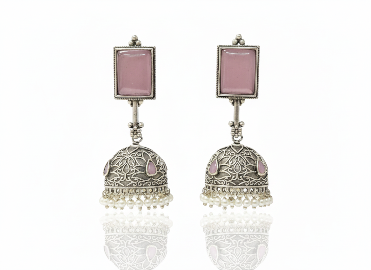 Oxidized silver jhumka earrings featuring rose quartz rectangular studs, intricate filigree dome work, soft pink stone accents, and delicate pearl drops.