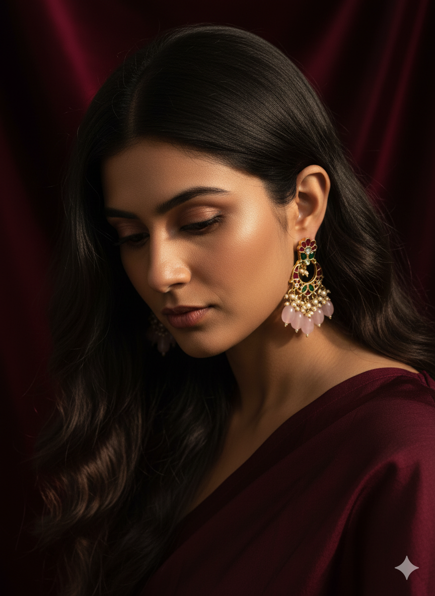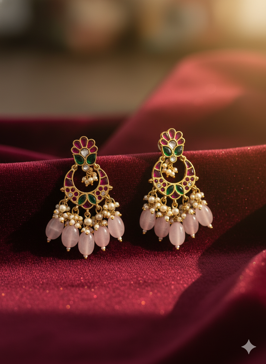 Exquisite Floral Chandbalis featuring traditional maroon and green stone settings, accented by delicate pearl clusters and elegant rose quartz teardrops. These lightweight yet statement-making earrings perfectly blend vintage Indian charm with a modern, feminine color palette.