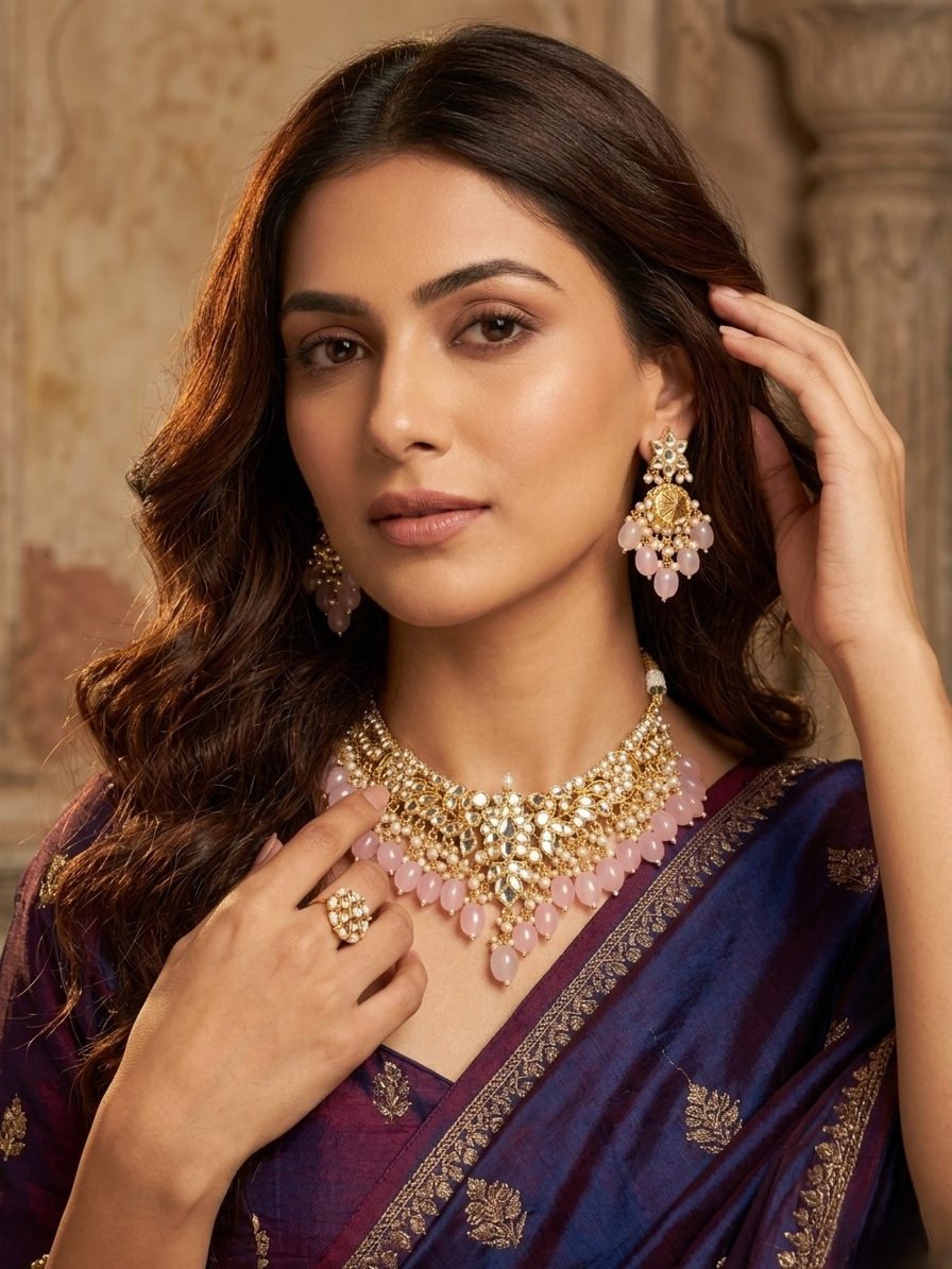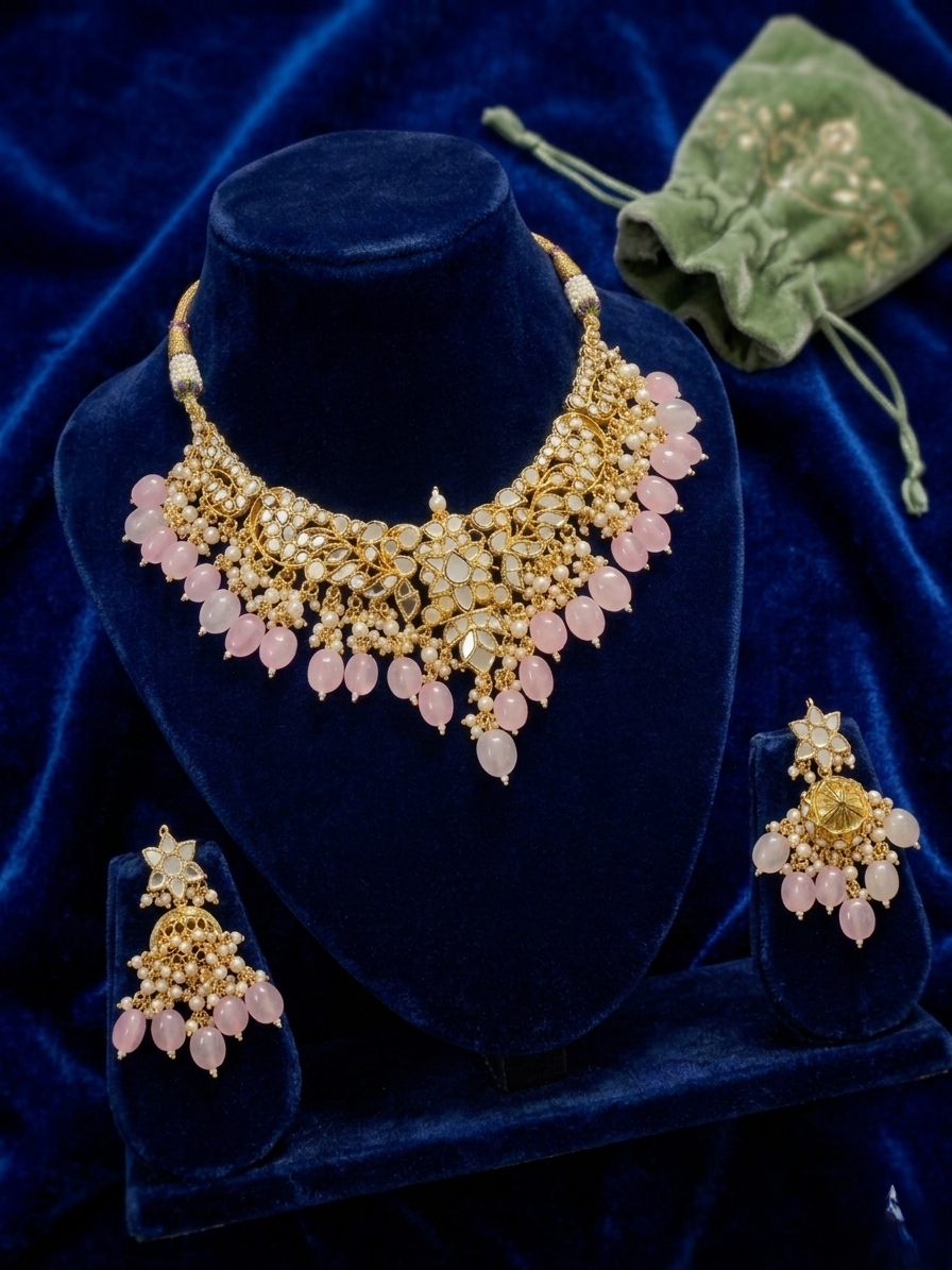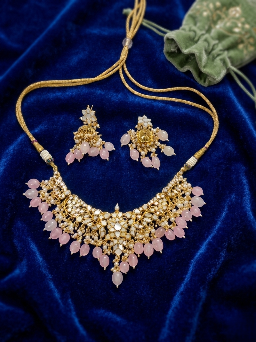 An elegant gold-plated choker set featuring intricate Kundan stonework, delicate seed pearls, and soft rose-pink quartz droplets. This handcrafted ensemble includes matching Jhumka-style earrings, perfect for adding a touch of vintage royalty to any festive attire.