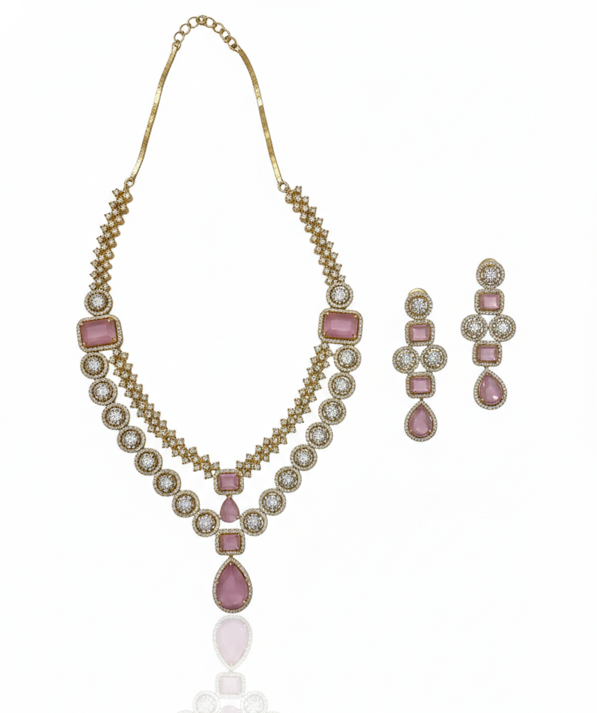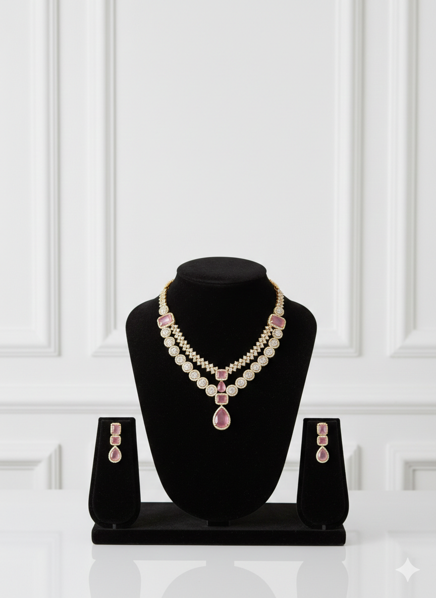 • Dual-Layered Design: The necklace features a sophisticated two-row V-shape, alternating between polished square-cut pink stones and shimmering round crystal halos.