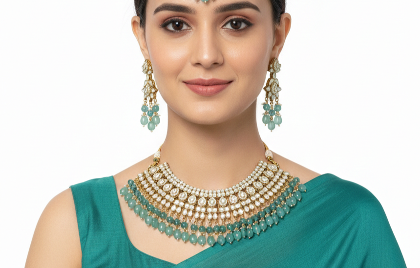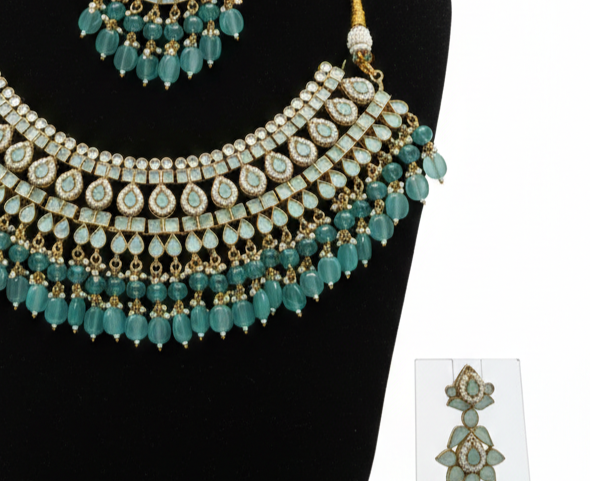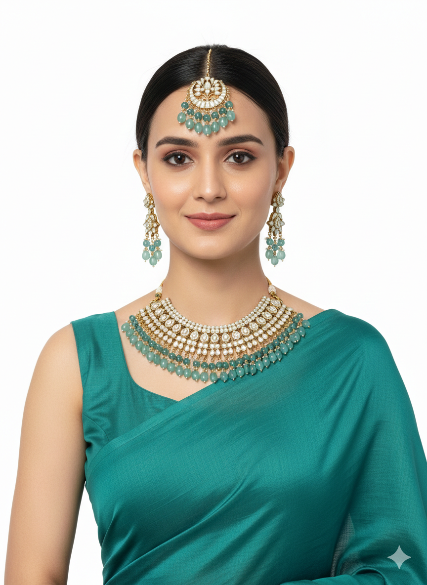 Graceful, radiant, and exquisitely detailed, this Royal Aqua Pearl Kundan Choker Set is designed to make a refined statement. Adorned with shimmering kundan-style stones arranged in intricate patterns, the choker is beautifully accented with cascading aqua-toned bead drops that add fluidity and charm.