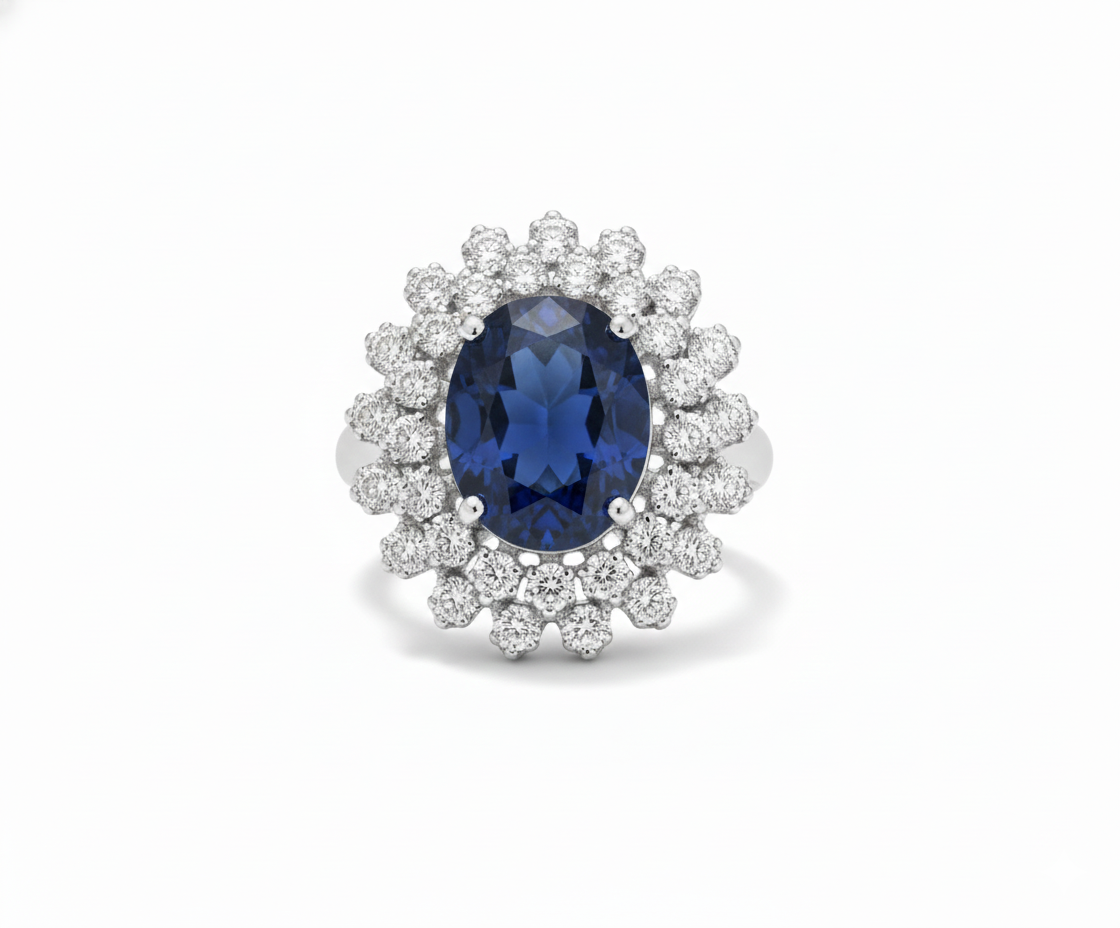 Be the first to review “Royal Blue Sapphire & Double-Diamond Halo Cocktail Ring”