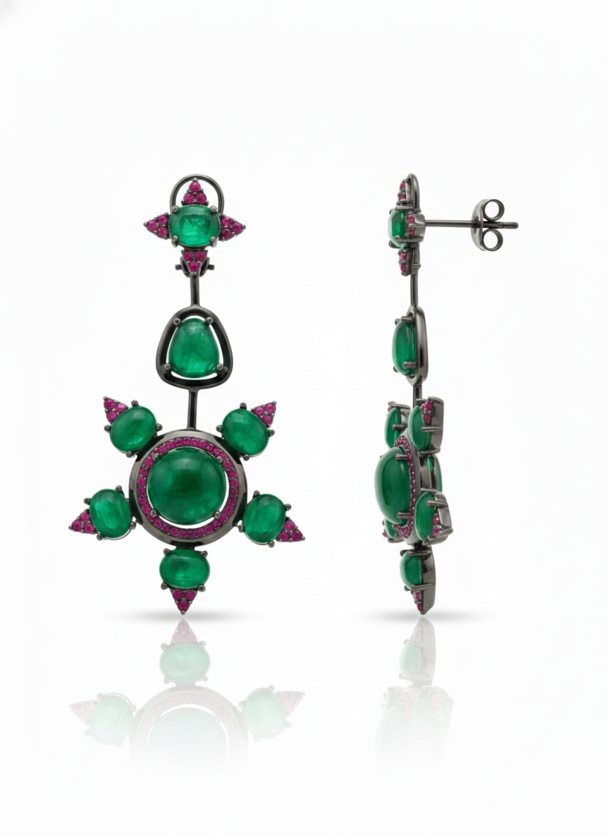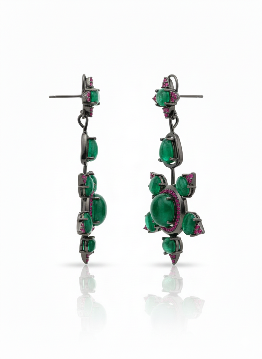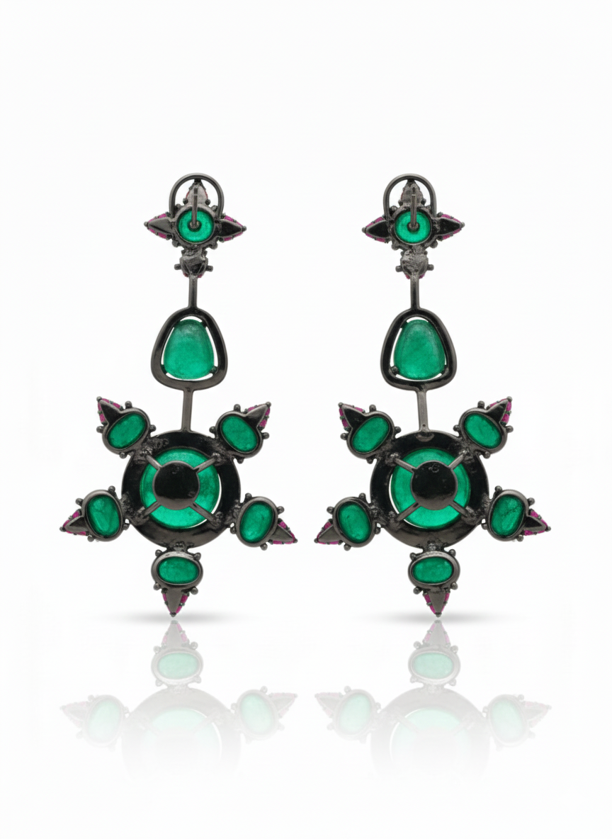 These exquisite emerald green statement drop earrings are crafted to make a bold style statement. Designed with multiple emerald-tone stones arranged in a striking geometric pattern, the earrings are beautifully accented with ruby-colored detailing that adds contrast and richness. The dark polished metal finish enhances the vibrancy of the stones, giving the earrings a premium designer appeal. Perfect for weddings, festive occasions, parties, and evening wear, these earrings pair elegantly with ethnic outfits and contemporary styles alike. A standout accessory for women who love unique, luxurious, and artistic jewelry designs.