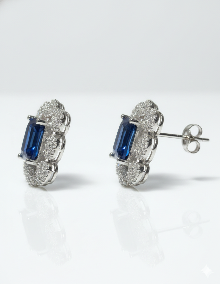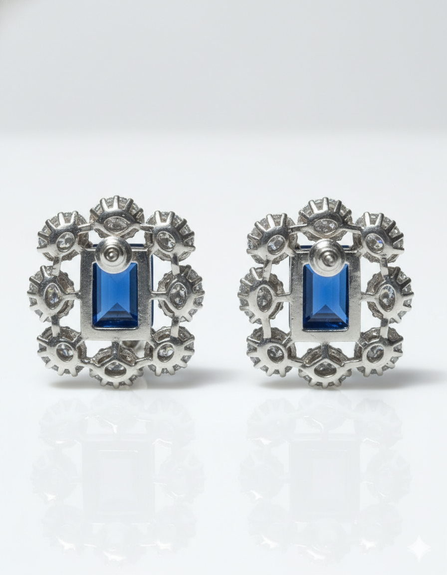 Centerpiece Brilliance: At the heart of each earring lies a premium emerald-cut blue crystal, boasting a deep, velvety sapphire hue and exceptional clarity.