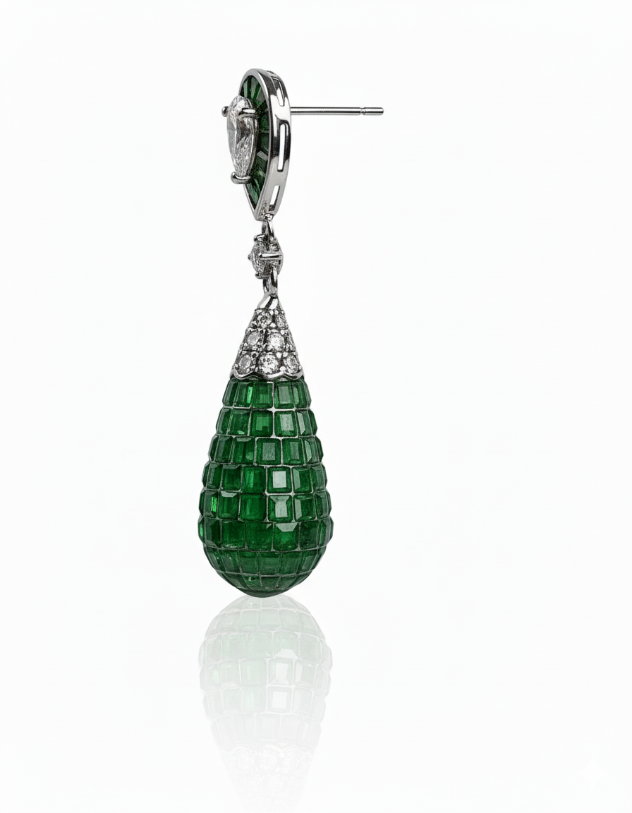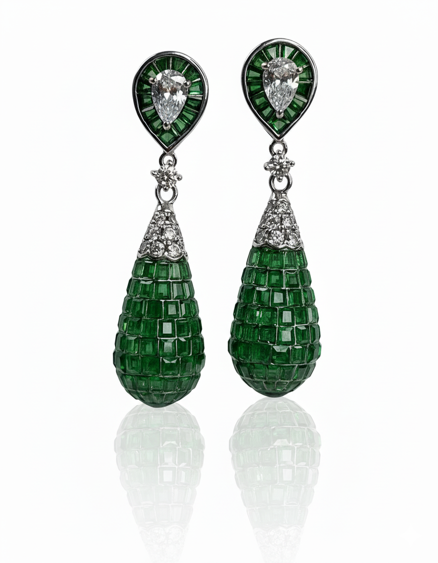 Luxurious emerald-green drop earrings featuring a sculpted mosaic teardrop design, crowned with sparkling diamond accents for refined elegance.