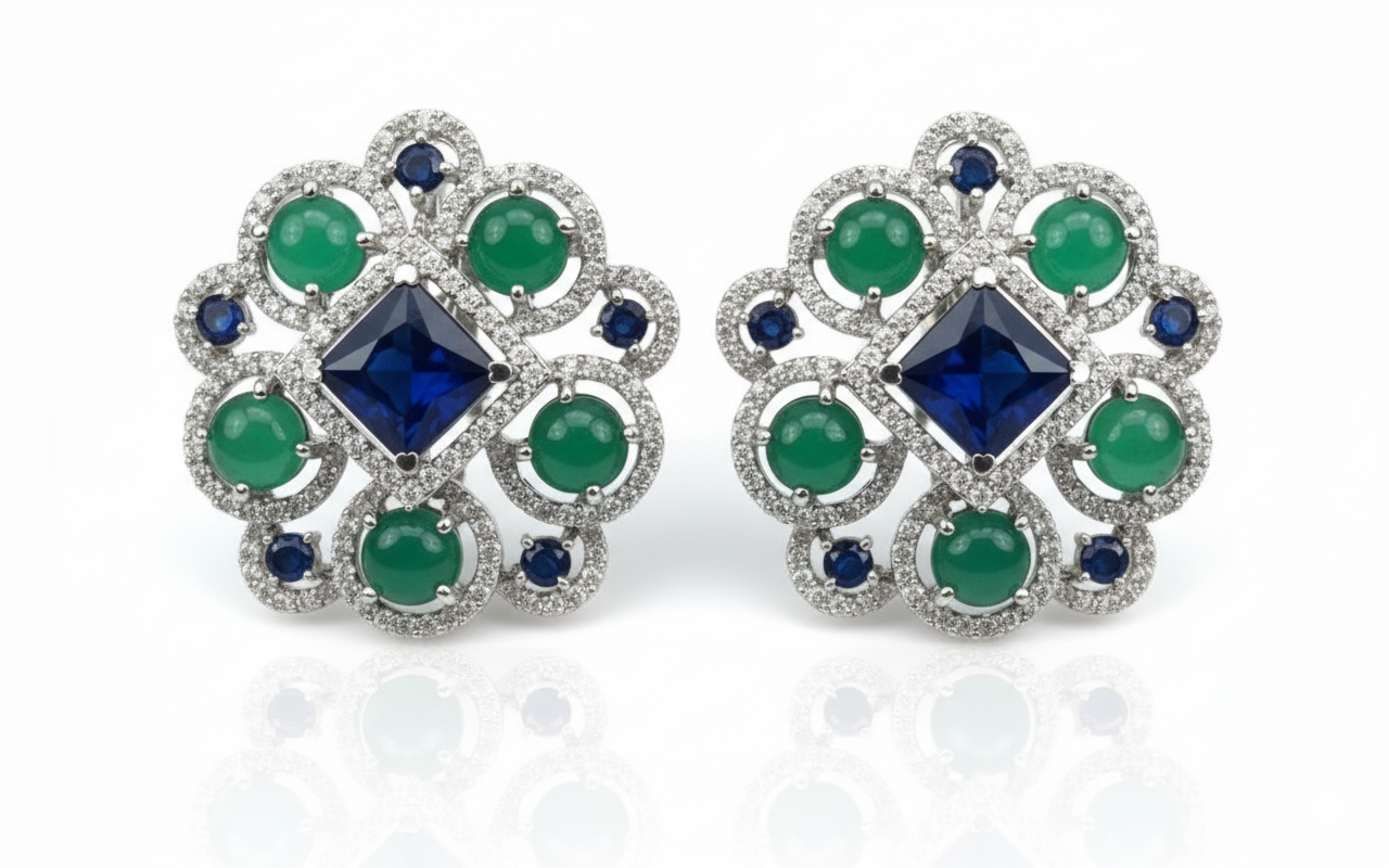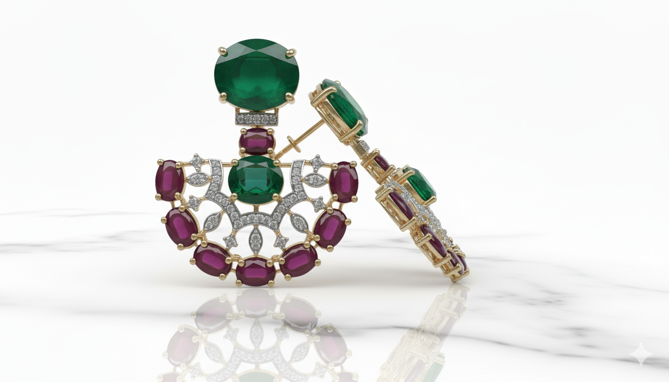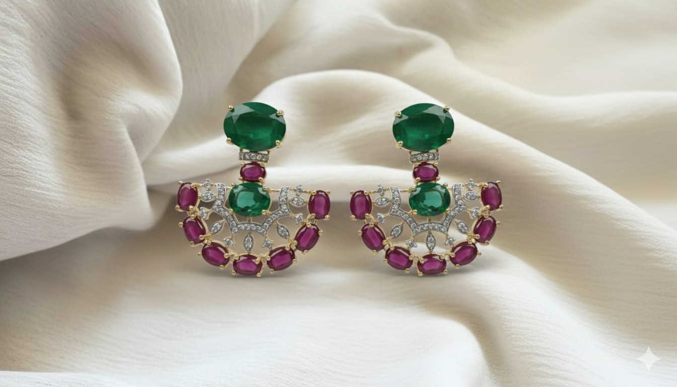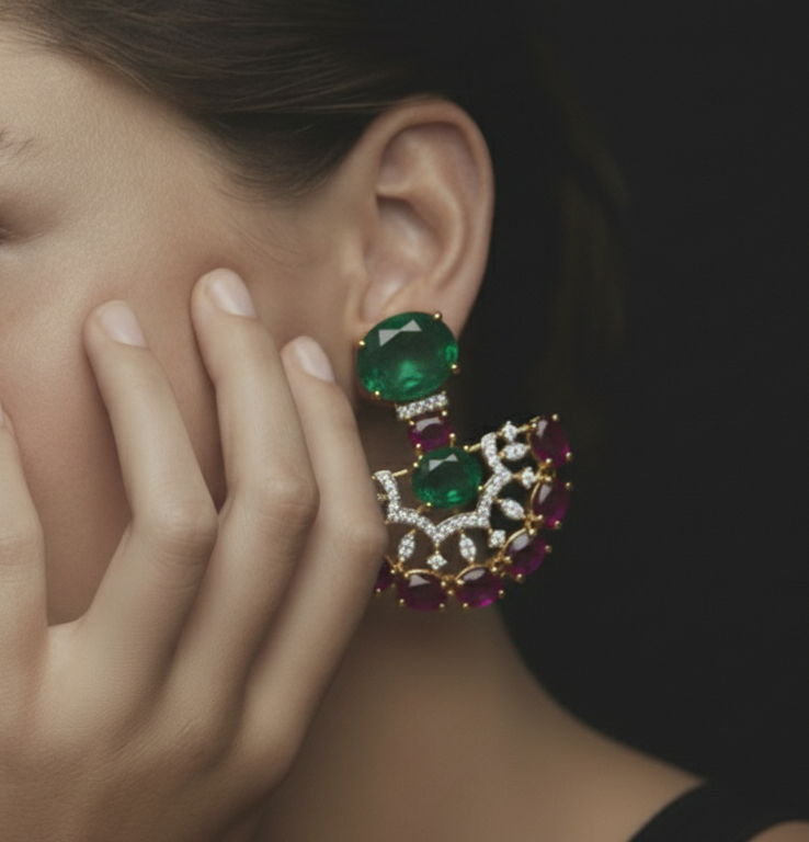 Exquisite gold-finish emerald and ruby Chandbalis featuring a regal double-crescent design and brilliant white stone accents. A sophisticated heritage statement piece that captures the essence of royal traditional jewelry.