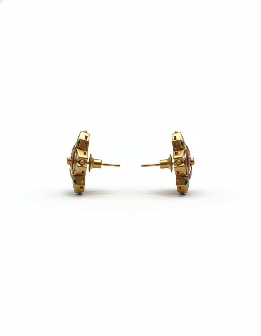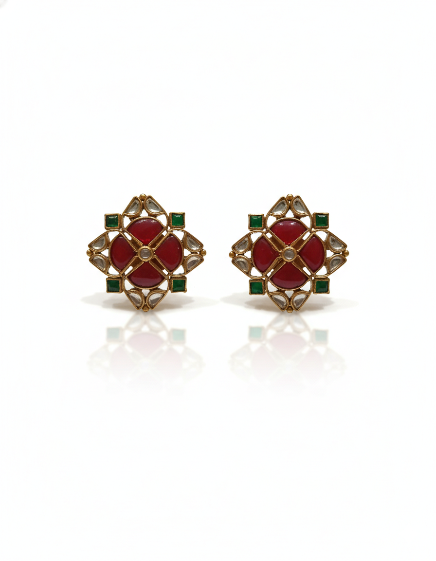 A striking blend of structure and sparkle, these statement stud earrings feature a rich ruby centerpiece framed by luminous polki-style diamonds and vibrant emerald accents. Set in warm gold tones, the geometric floral design reflects heritage craftsmanship with a contemporary edge — perfect for those who love bold elegance and timeless luxury.