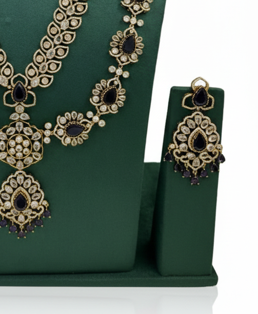 Step into a world of timeless luxury with this exquisite handcrafted bridal jewelry set. This ensemble features a majestic Nakshi-work choker paired with a grand long Rani Haar. The choker is meticulously detailed with traditional floral and bird motifs, accented by ruby-pink and emerald-green stones.
