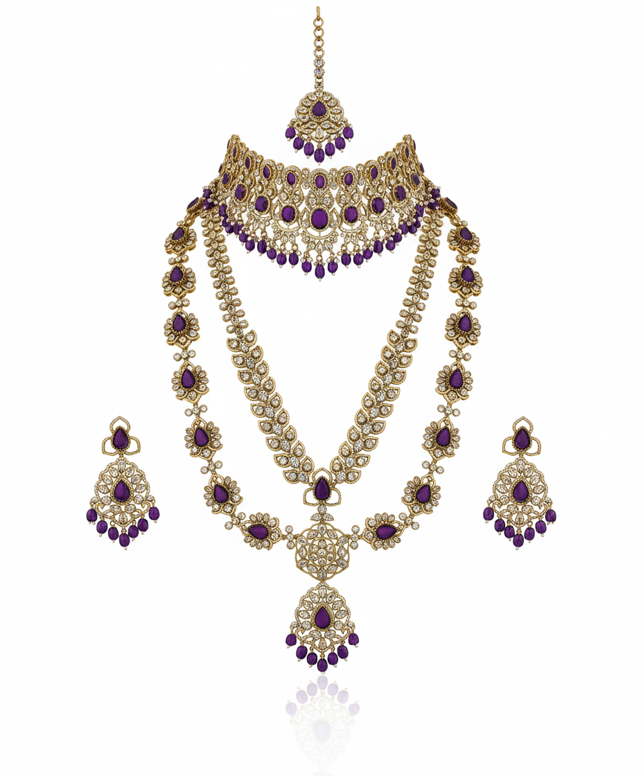A regal bridal jewelry set comprising a detailed antique-finish choker, a multi-strand pearl long necklace (Rani Haar), and matching earrings. Featuring intricate Polki work and traditional motifs, this set is the epitome of classic Indian craftsmanship for weddings.